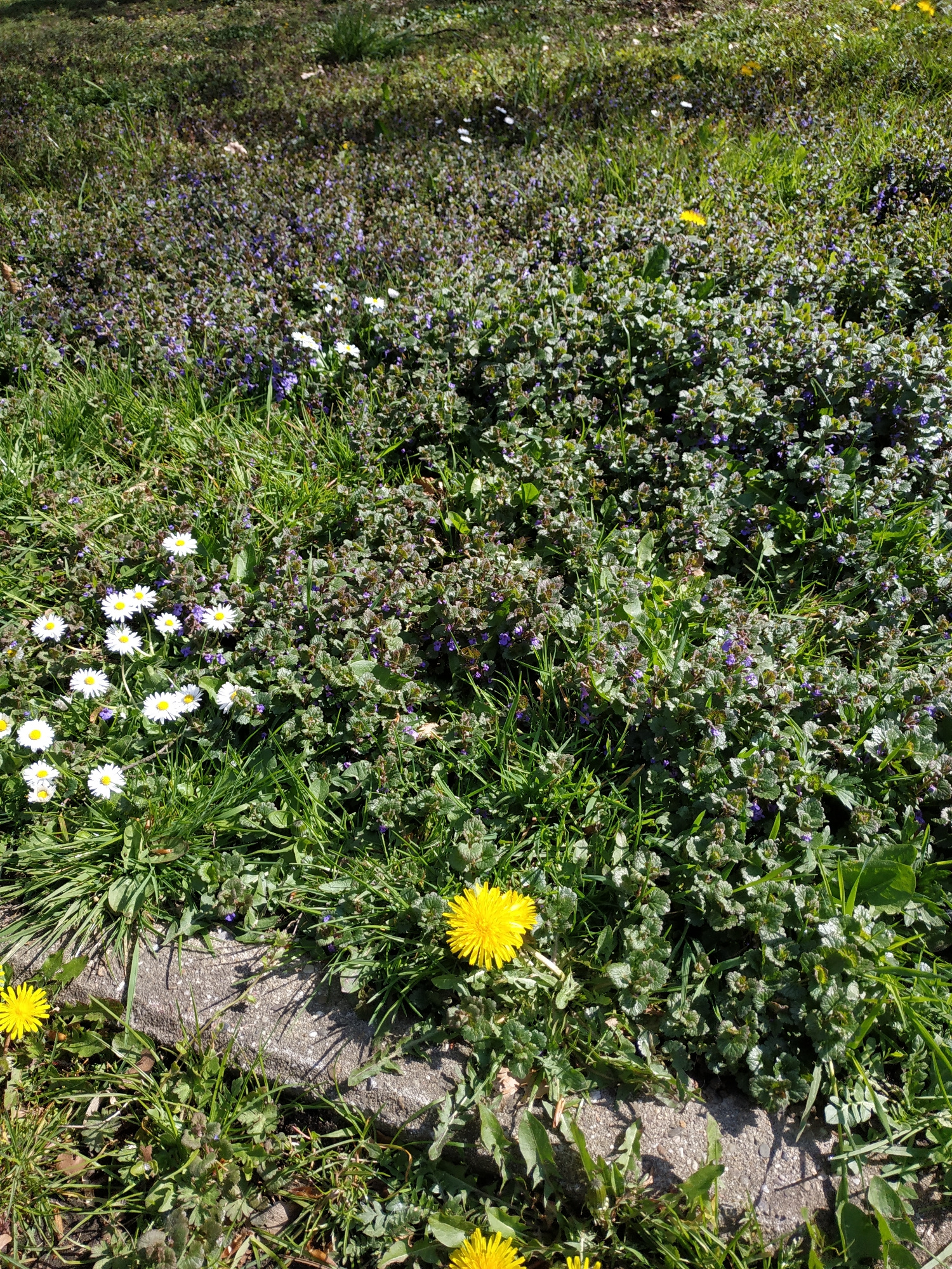The image shows a patch of ground in Dortmund, Germany, covered in a variety of plants. There is green grass, and several other types of vegetation, including white daisies, yellow dandelions, and groβ¦read more