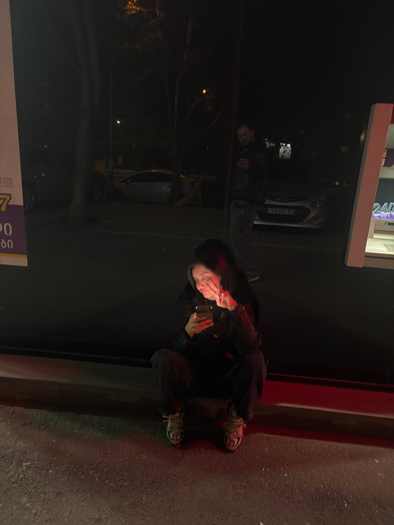 A young woman with dark hair is crouching on the sidewalk in front of a shop window, holding a mobile phone and making a peace sign with her fingers. She is wearing dark clothing and light-colored sne…read more