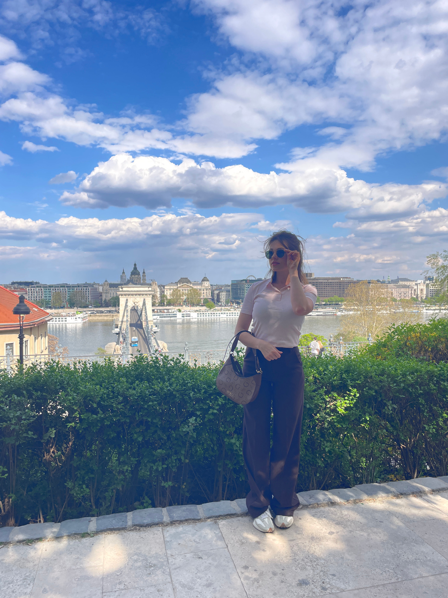 A young woman is captured in a full-body outdoor shot, posing on a sunny day with a prominent cityscape and river in the background. She stands on a light-colored paved path next to a dense green bush…read more
