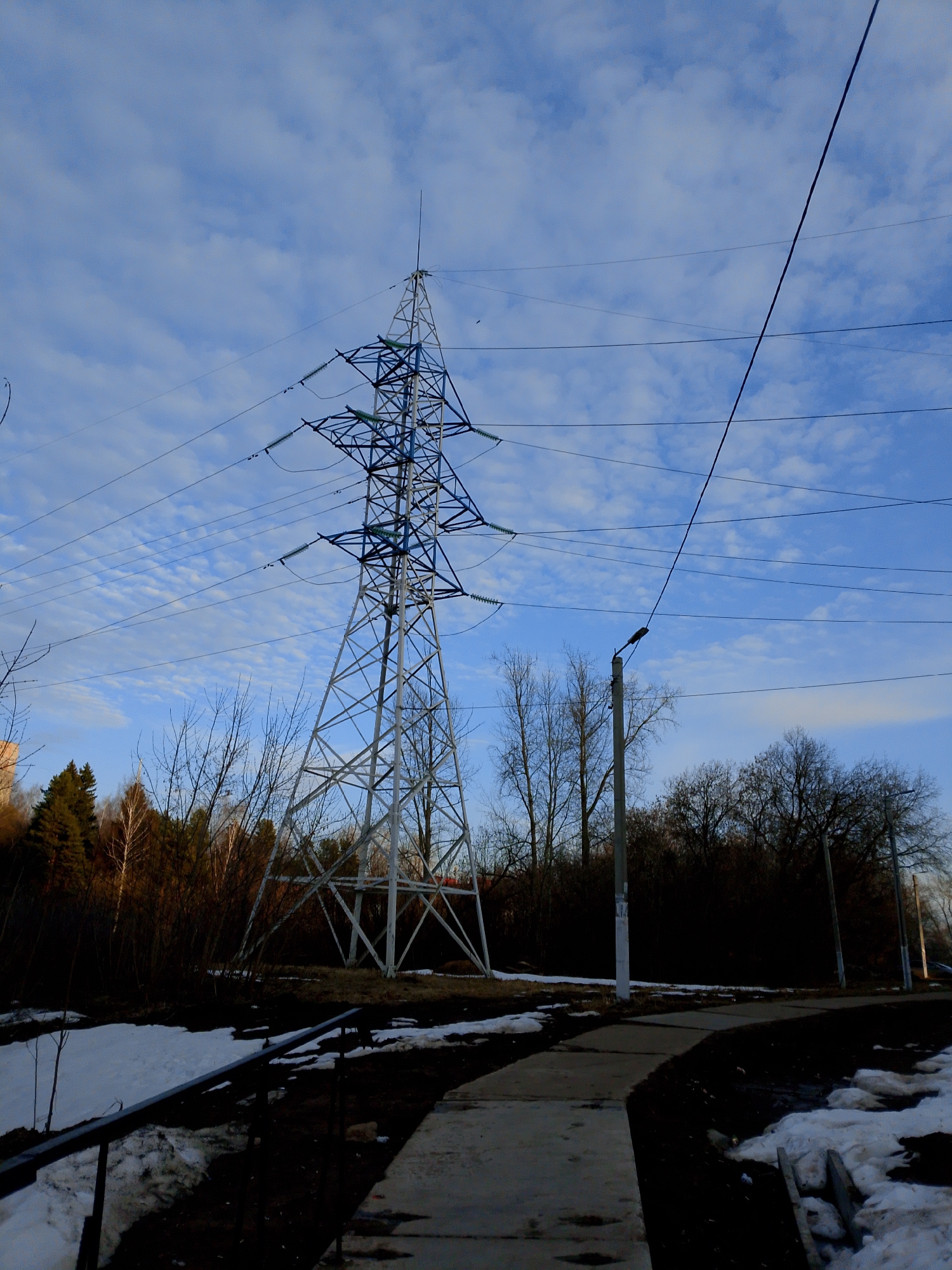 The image depicts an electrical transmission tower in a partially melted, snowy environment. The tower is painted with white and blue paint. Bare trees and vegetation are visible in the background. A…read more