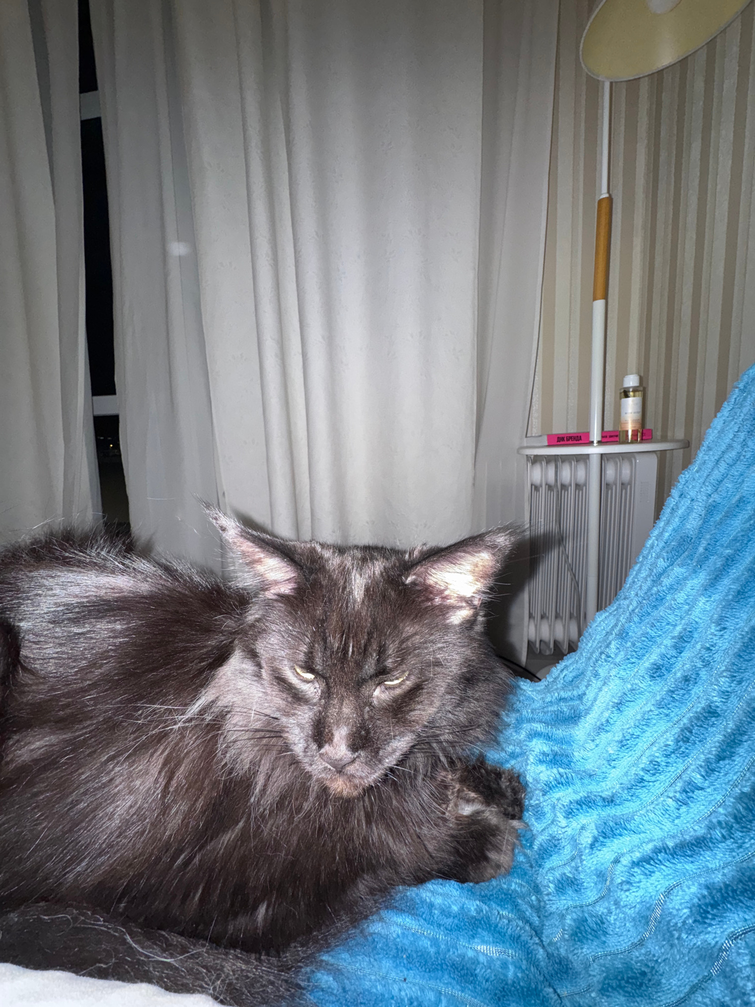 A dark grey, long-haired cat, possibly a Maine Coon, is resting comfortably in an indoor setting. The cat is positioned on a blue, textured, fuzzy blanket, with its head slightly tilted and one eye pa…read more