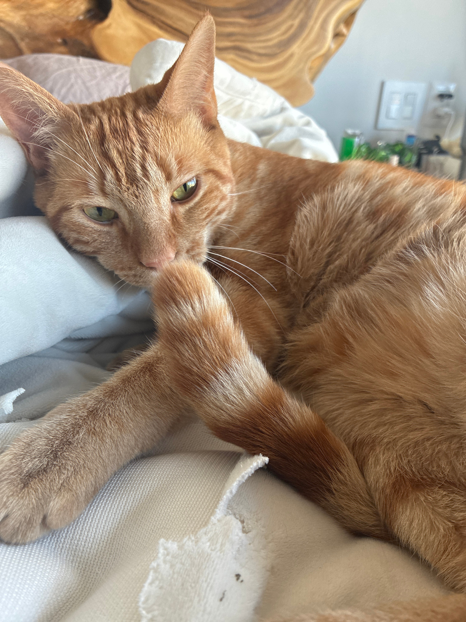 A ginger tabby cat is lying down on a white blanket. The cat's head is tilted to the left, and its paw rests on its face. The cat has green eyes and a striped forehead. Part of a wooden chair is visib…read more