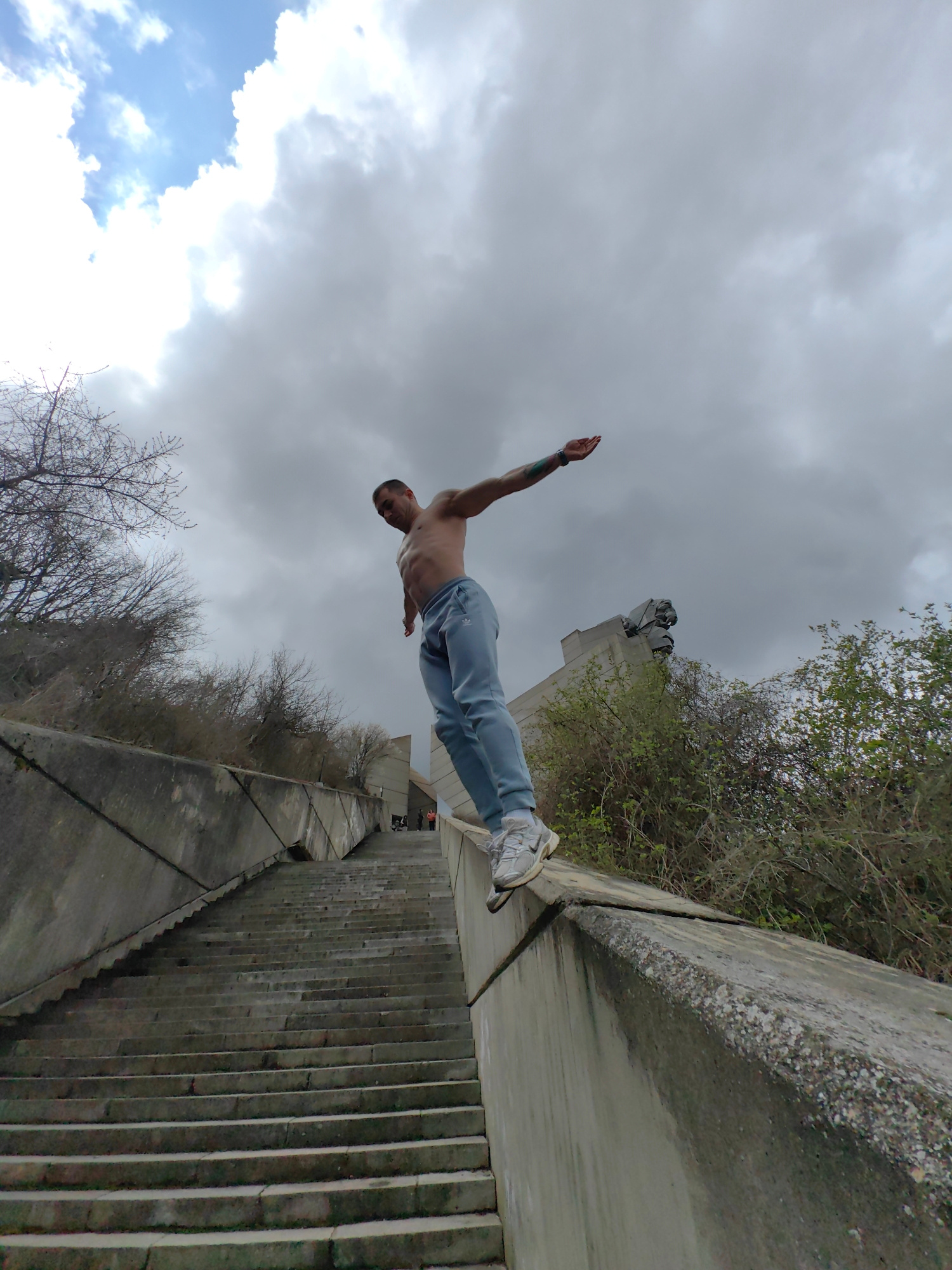 A low-angle shot shows a man standing on a concrete ledge beside a staircase. The man is shirtless, wearing light blue sweatpants and white sneakers. His arms are outstretched. A tattoo is visible on…read more