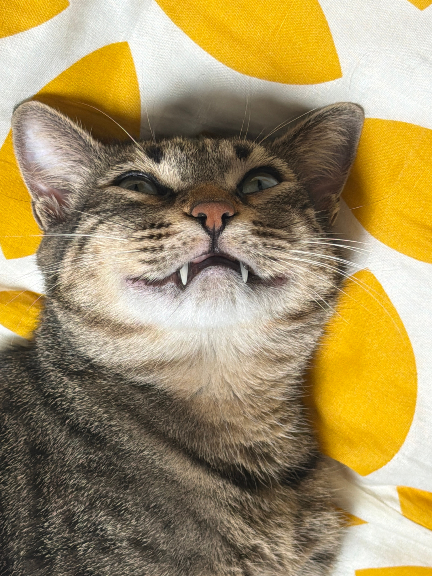 A close-up, high-angle shot captures a domestic tabby cat lying on its back or side, gazing directly into the camera. The cat has mottled brown, grey, and black fur with lighter cream-colored fur on i…read more