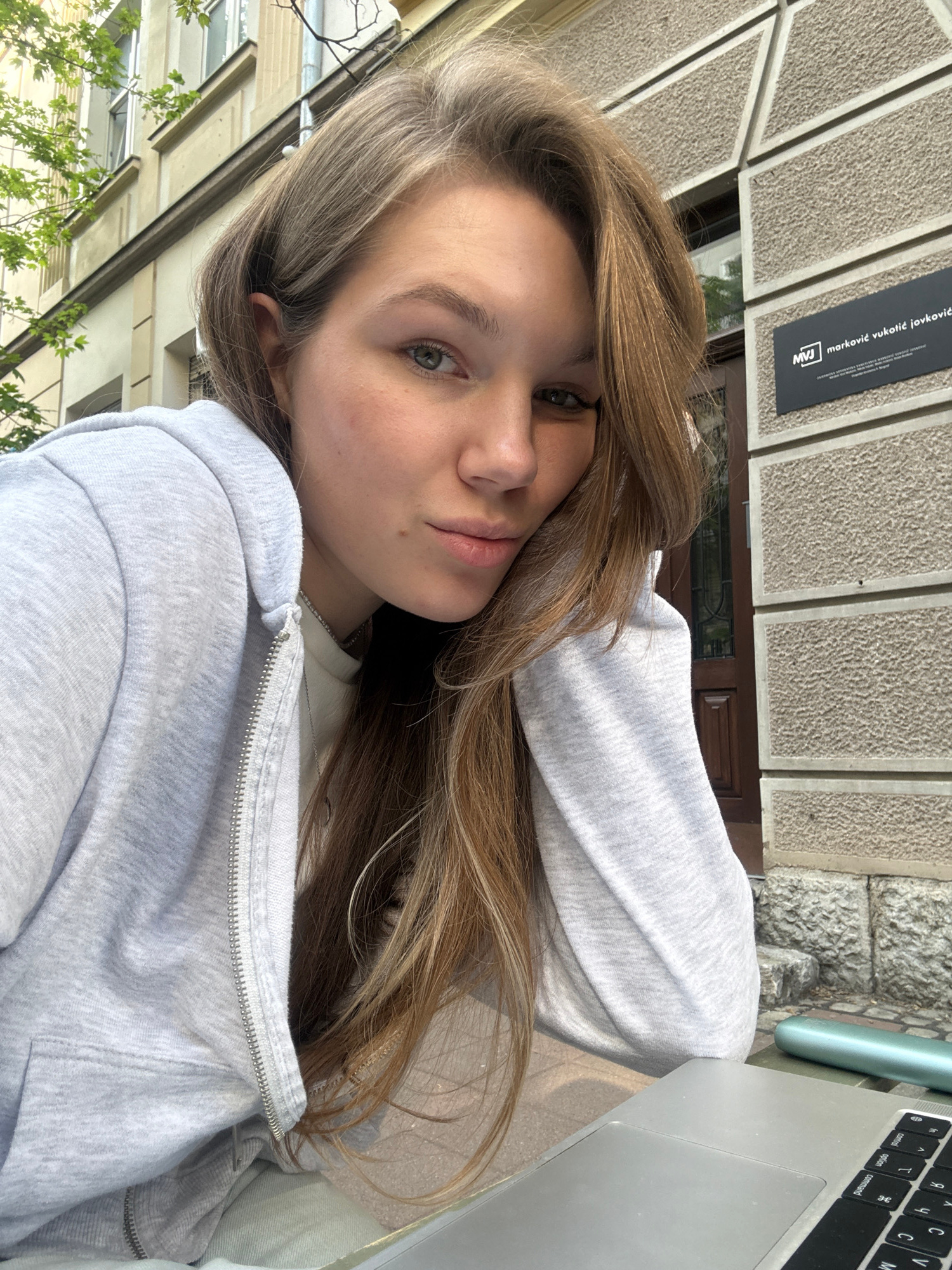 A young woman is positioned outdoors in Belgrade, Serbia. She is fair-skinned with light brown hair. She is wearing a light gray zip-up hoodie over a white shirt, and a thin silver necklace. She is si…read more