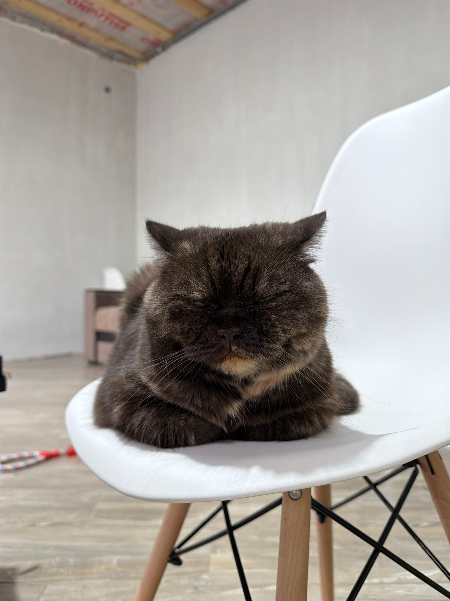 A tortoiseshell cat is resting in a white chair. The chair has light wood legs joined to the seat by black metal rods. The background includes a grey wood-look floor, partially visible objects in the…read more