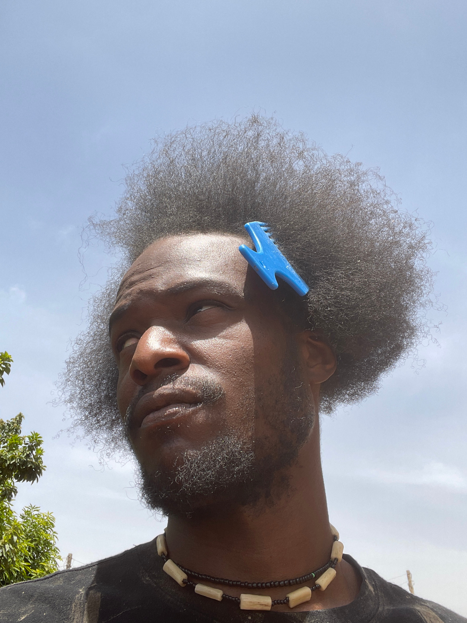 A medium close-up shot depicts a man with a dark complexion and dense, coiled hair. A blue plastic comb is partially embedded in his hair near his forehead. He has a thick, graying beard. He wears a b…read more