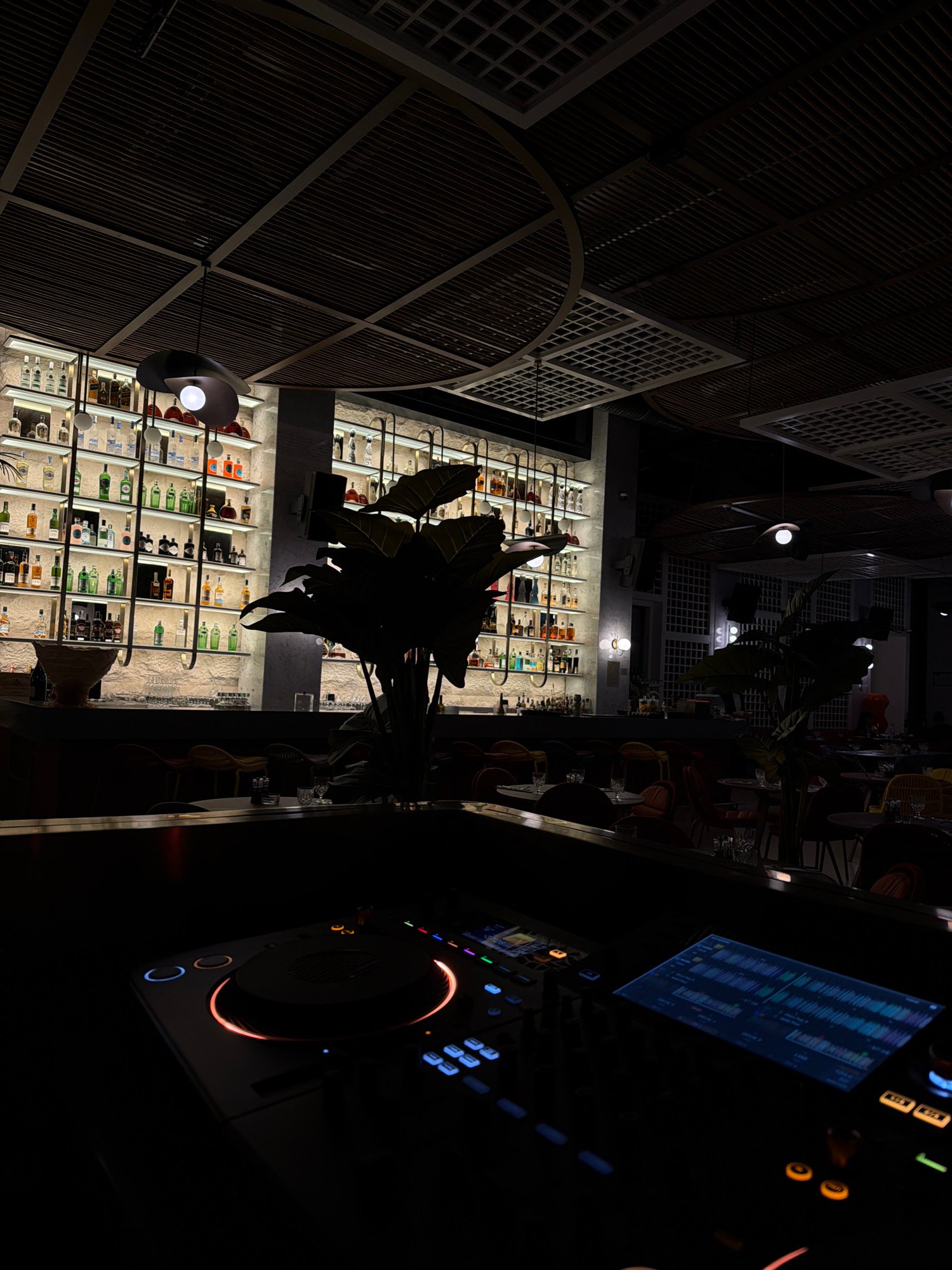 The interior of a bar in Budva, Montenegro is shown. A DJ console sits on a dark counter. Shelves stocked with bottles of liquor are illuminated behind a large leafy plant. Above the shelves are light…read more