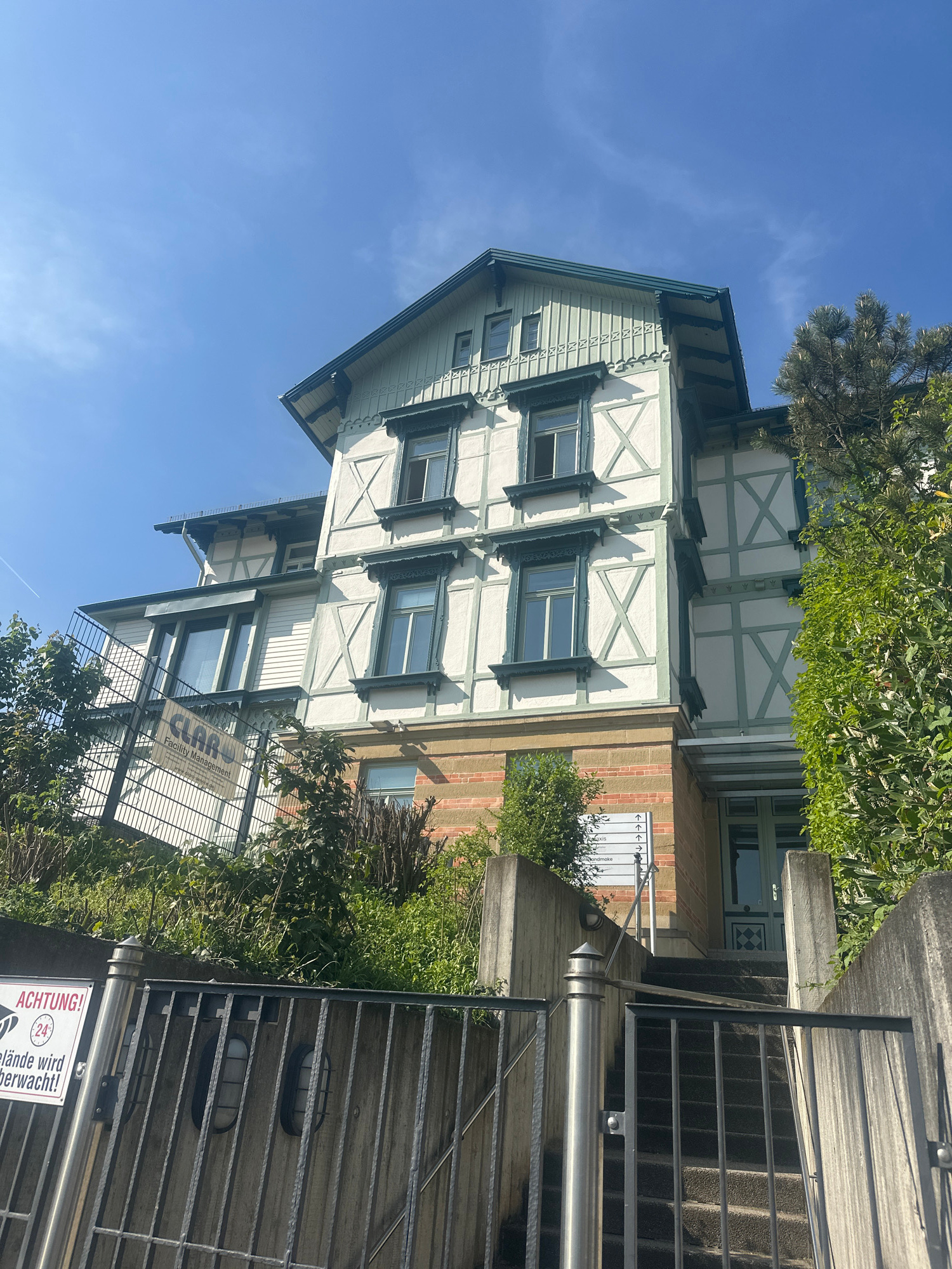 The image, originally oriented 90 degrees clockwise, captures a multi-story building with traditional German architectural elements under a clear blue sky during daylight hours in Stuttgart, Germany.…read more