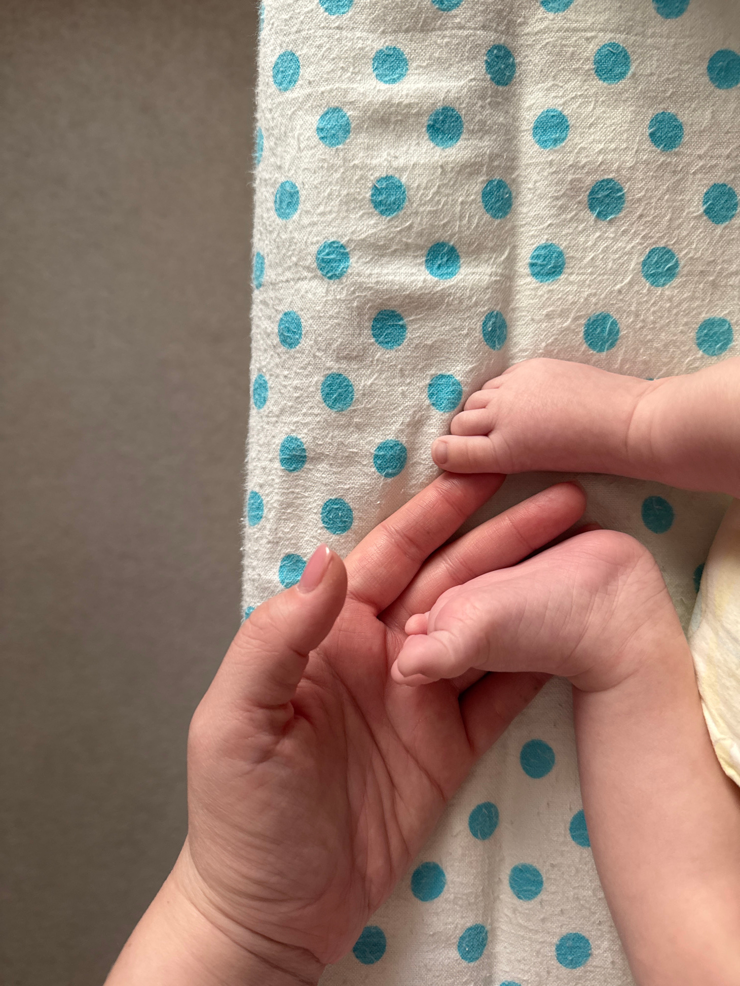 A close-up shot depicts a baby's feet resting in an adult's hand. The baby's skin is soft and pink, the toes tiny and delicate. The adult's hand is pale, with short, neatly manicured nails. The backdr…read more