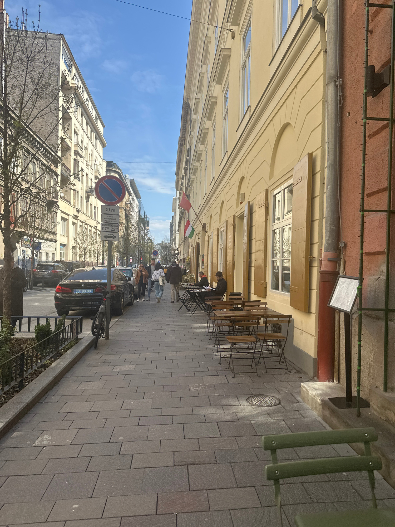 The image depicts a street scene in Budapest, Hungary, characterized by a narrow street lined with tall, old buildings on both sides. The buildings are predominantly light-colored with ornate architec…read more