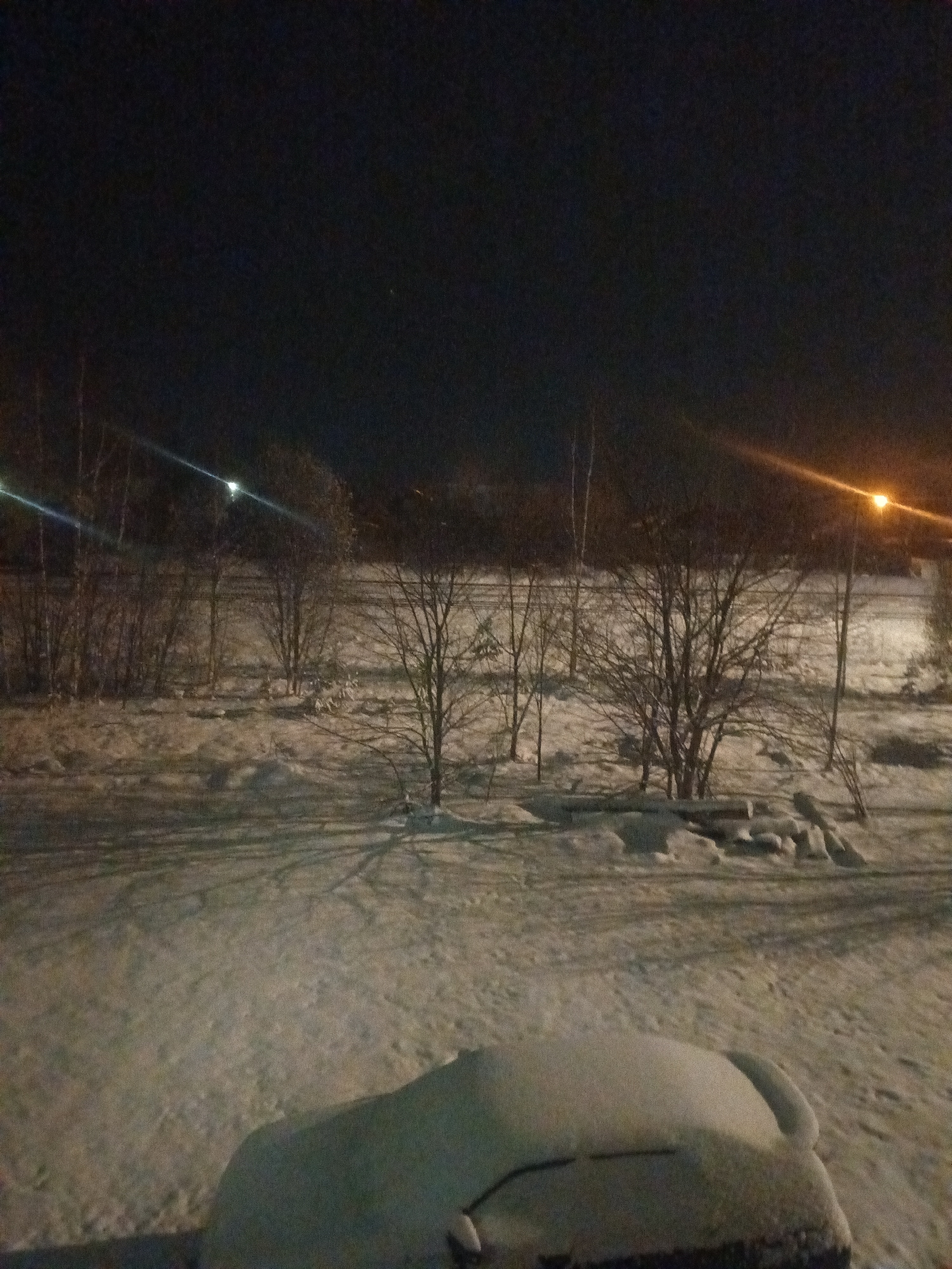 The image captures a static, snowy winter scene at night in Andreyevo, Russia. The foreground features the rear of a dark vehicle partially covered by a fresh layer of snow. Beyond the car, the ground…read more