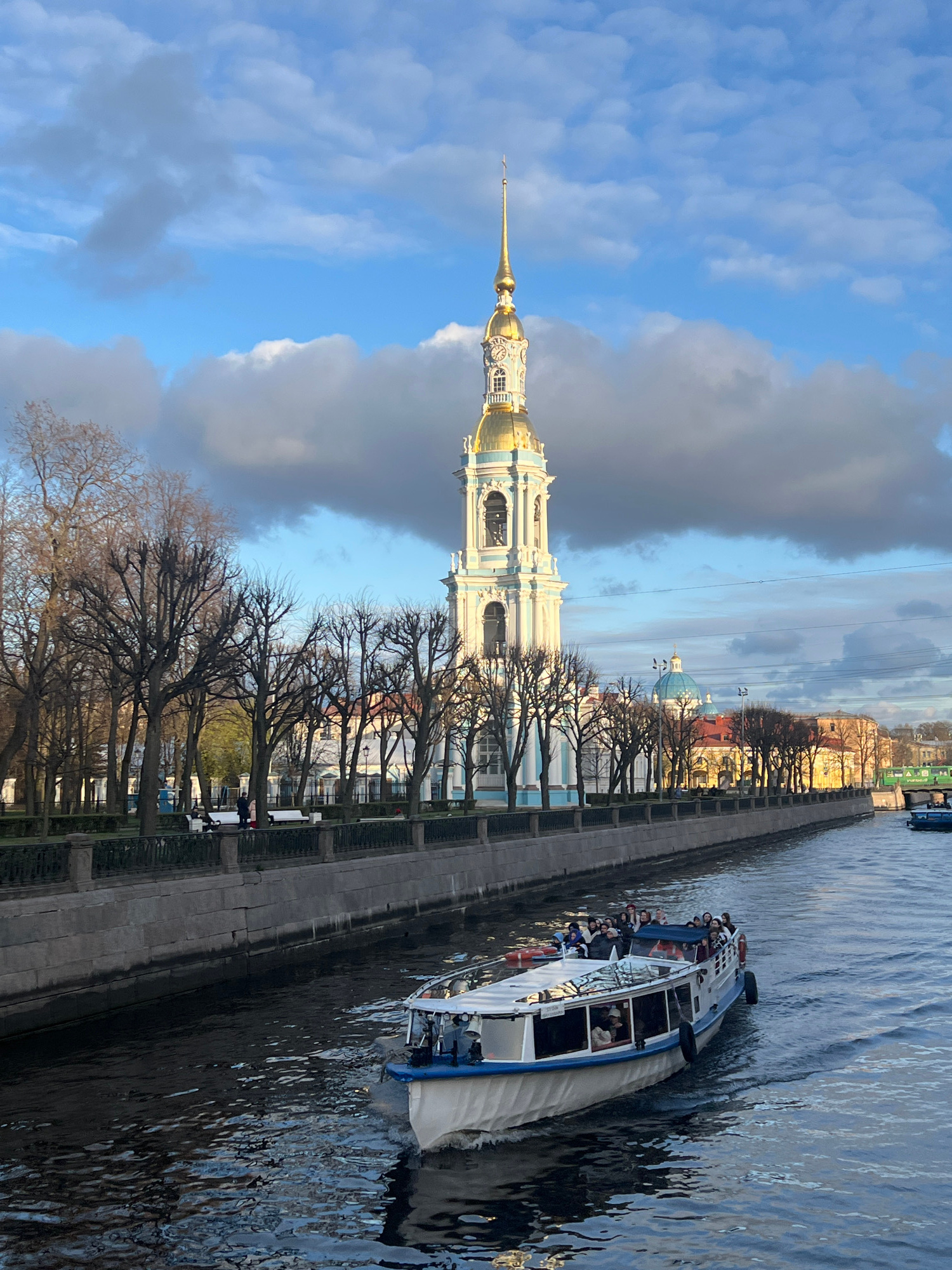 The photograph presents a view of Saint Petersburg, Russia. The Peter and Paul Cathedral, characterized by its golden spire, dominates the left side of the frame. A canal, presumably a part of the Nev…read more