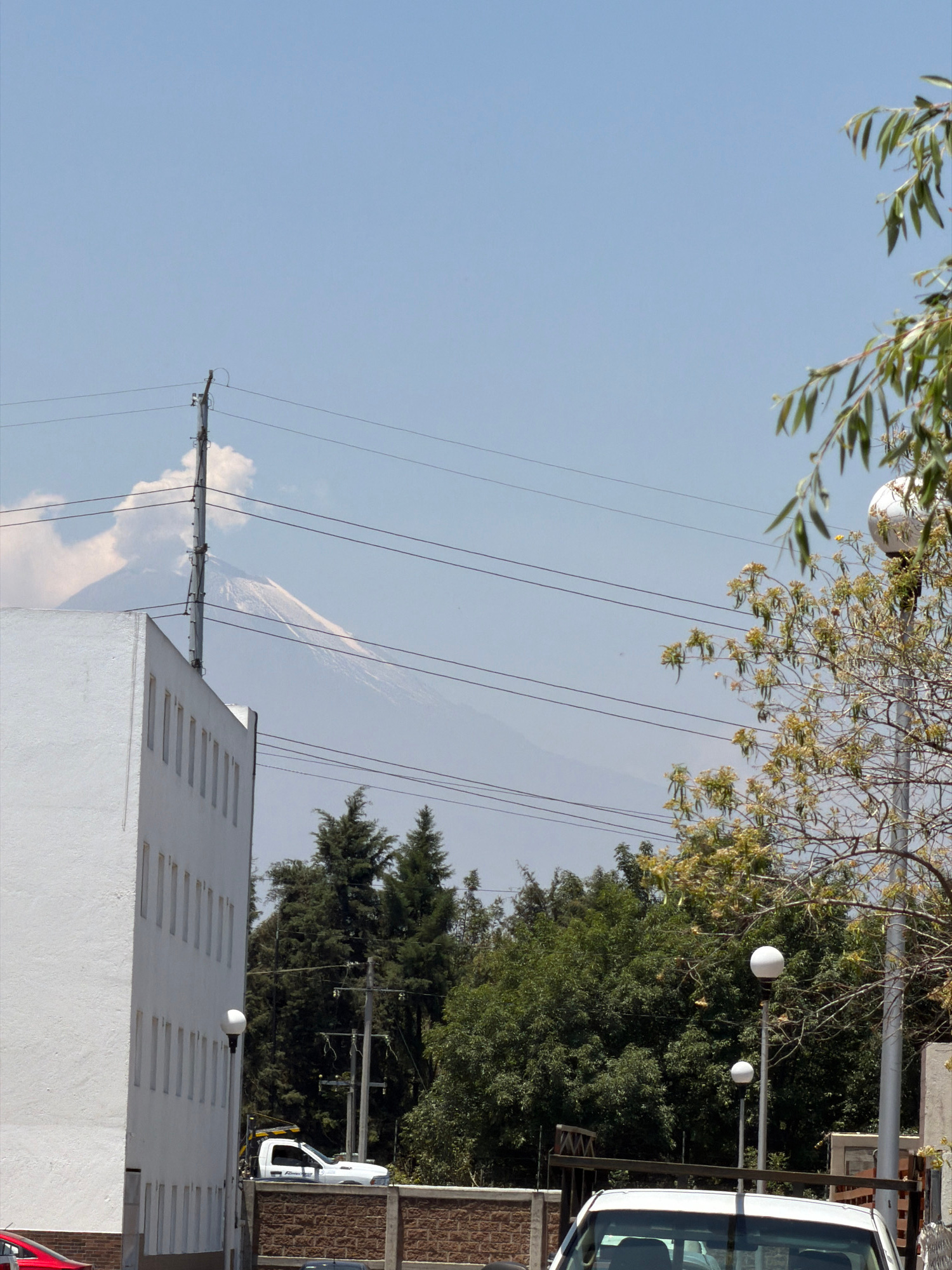 The image depicts a street scene in San Andrés Cholula, Mexico, characterized by a mix of urban and natural elements. In the foreground is a white building with evenly spaced, narrow vertical openings…read more