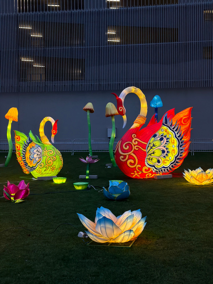 The image captures an enchanting outdoor evening scene, likely an illuminated art exhibition or lantern festival. The primary focus is on a collection of brightly lit lanterns arranged on a dark greenβ¦read more