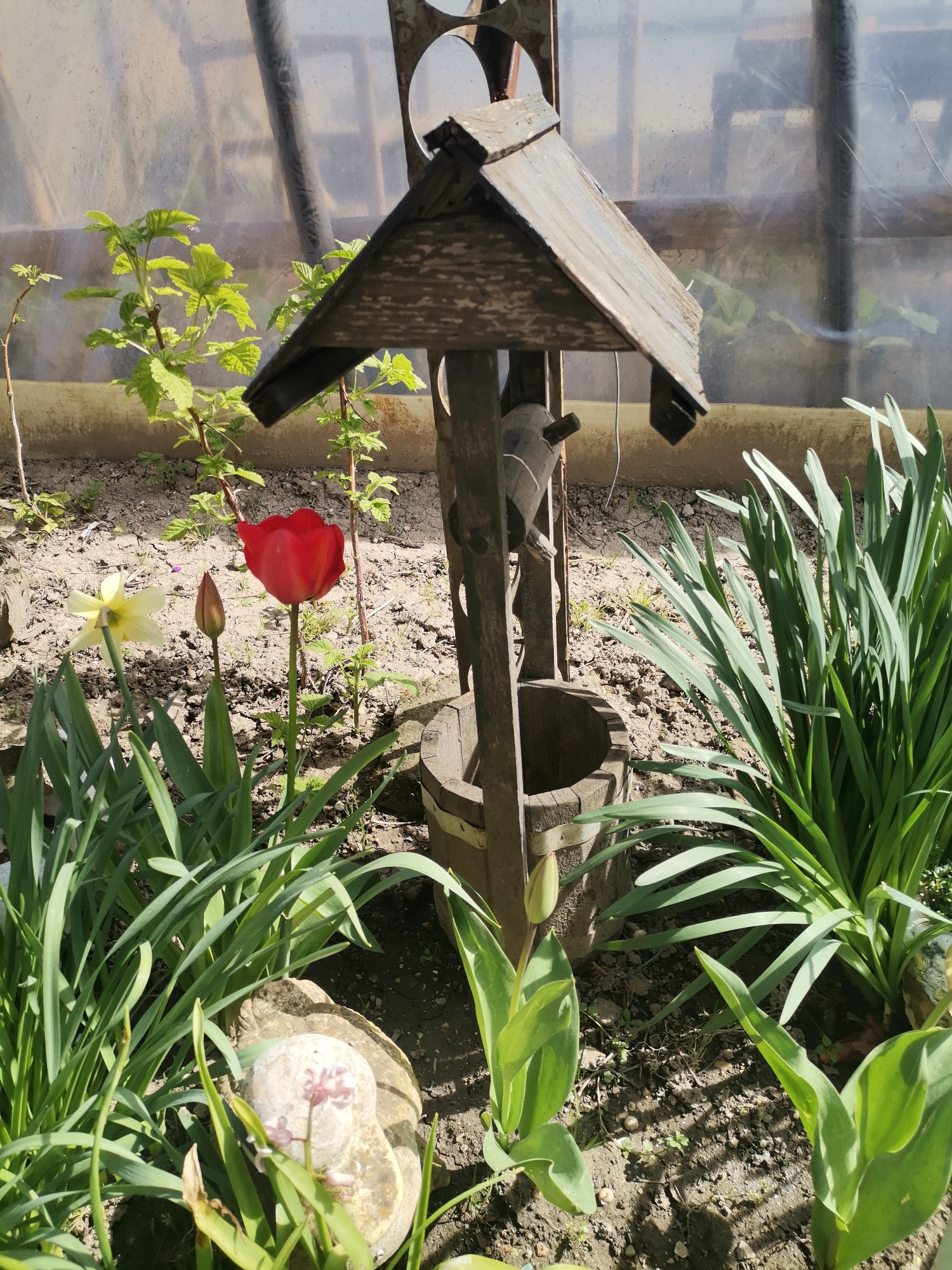 This image captures a vibrant garden scene in Obrochishte, Bulgaria, under bright, natural daylight, likely in springtime. The central focus is a rustic, decorative wooden well, featuring a small, gab…read more