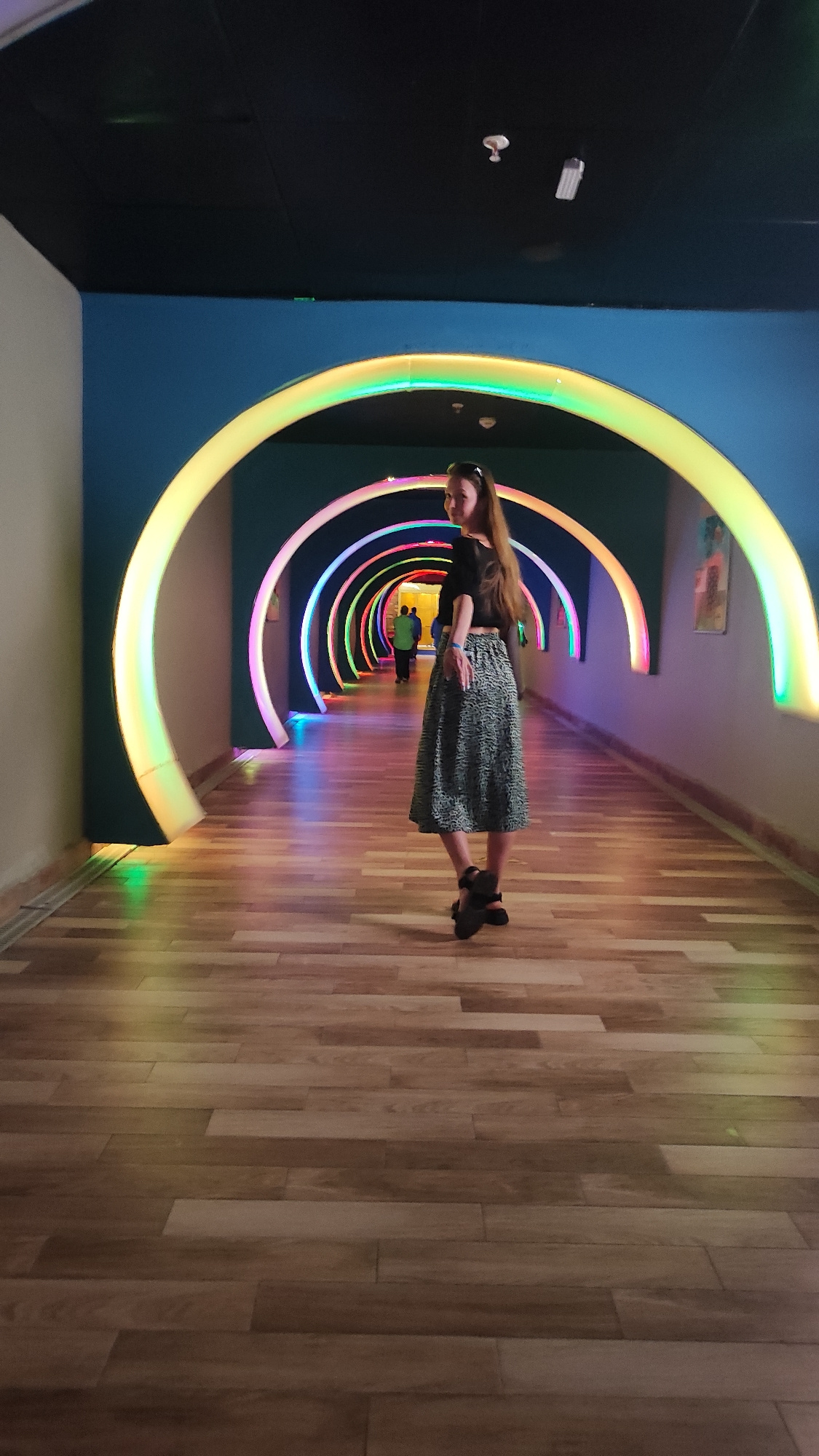 An indoor hallway, characteristic of a recreational facility or resort in Alanya, Turkey, is depicted. The environment features a sequence of progressively smaller, brightly illuminated archways, each…read more