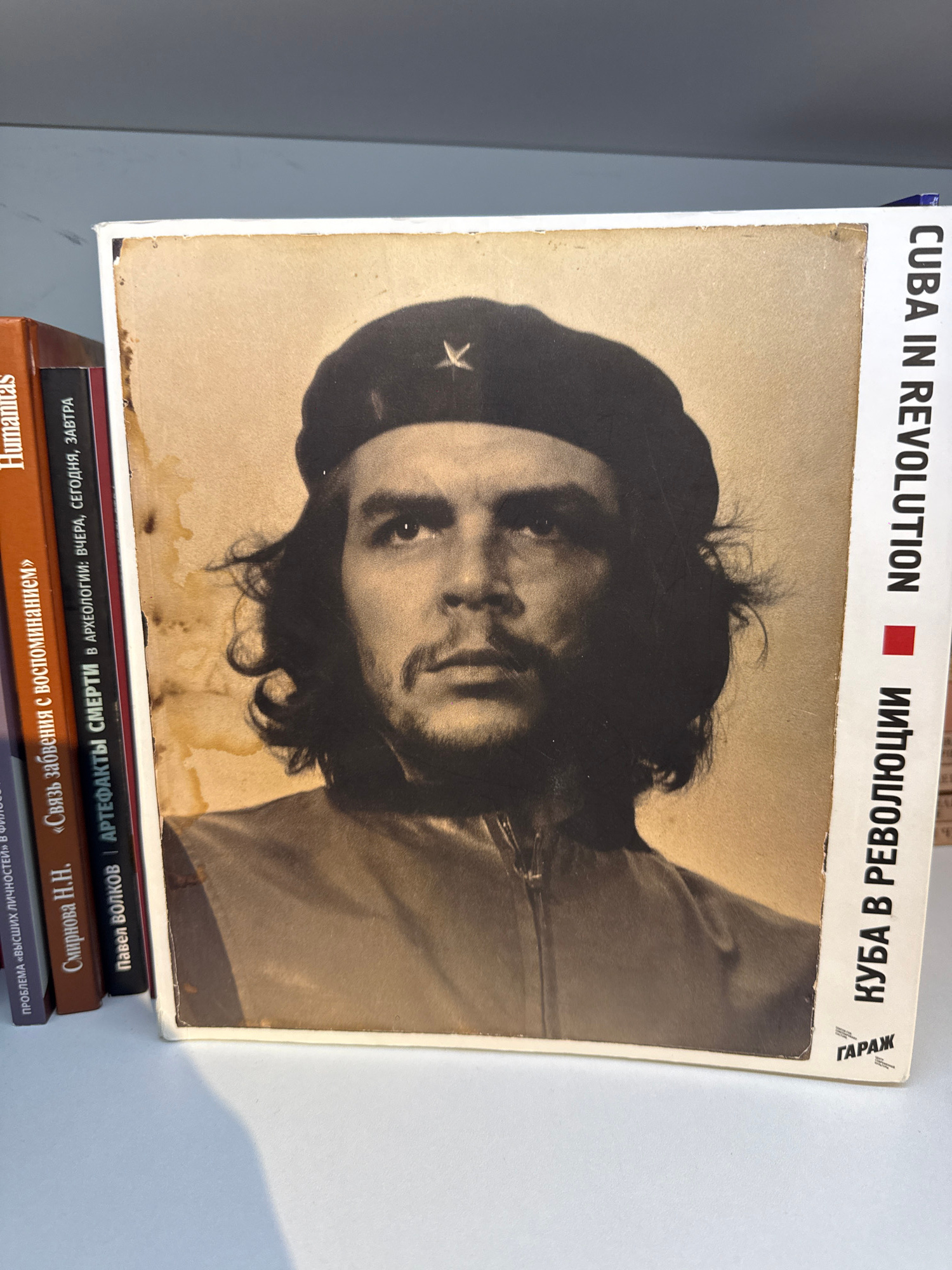 The image shows a book titled "CUBA IN REVOLUTION" with the same title in Russian, "КУБА В РЕВОЛЮЦИИ," and a photograph of Che Guevara on the cover. The book sits on top of a stack of three other book…read more