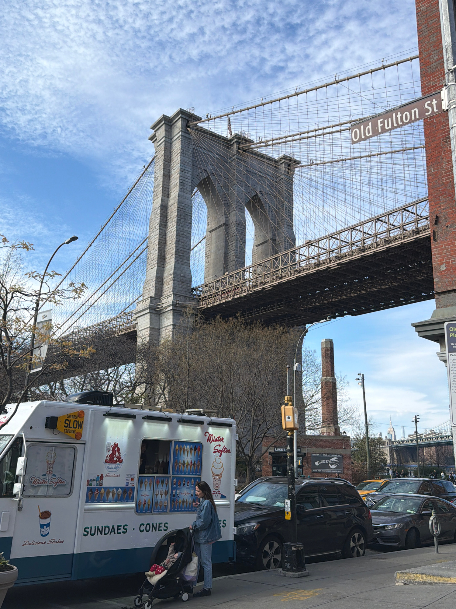 This is a street-level view of the Brooklyn Bridge in New York City. The bridge's massive stone tower looms overhead, with "Old Fulton St" sign. A Mister Softee ice cream truck is parked on the side o…read more
