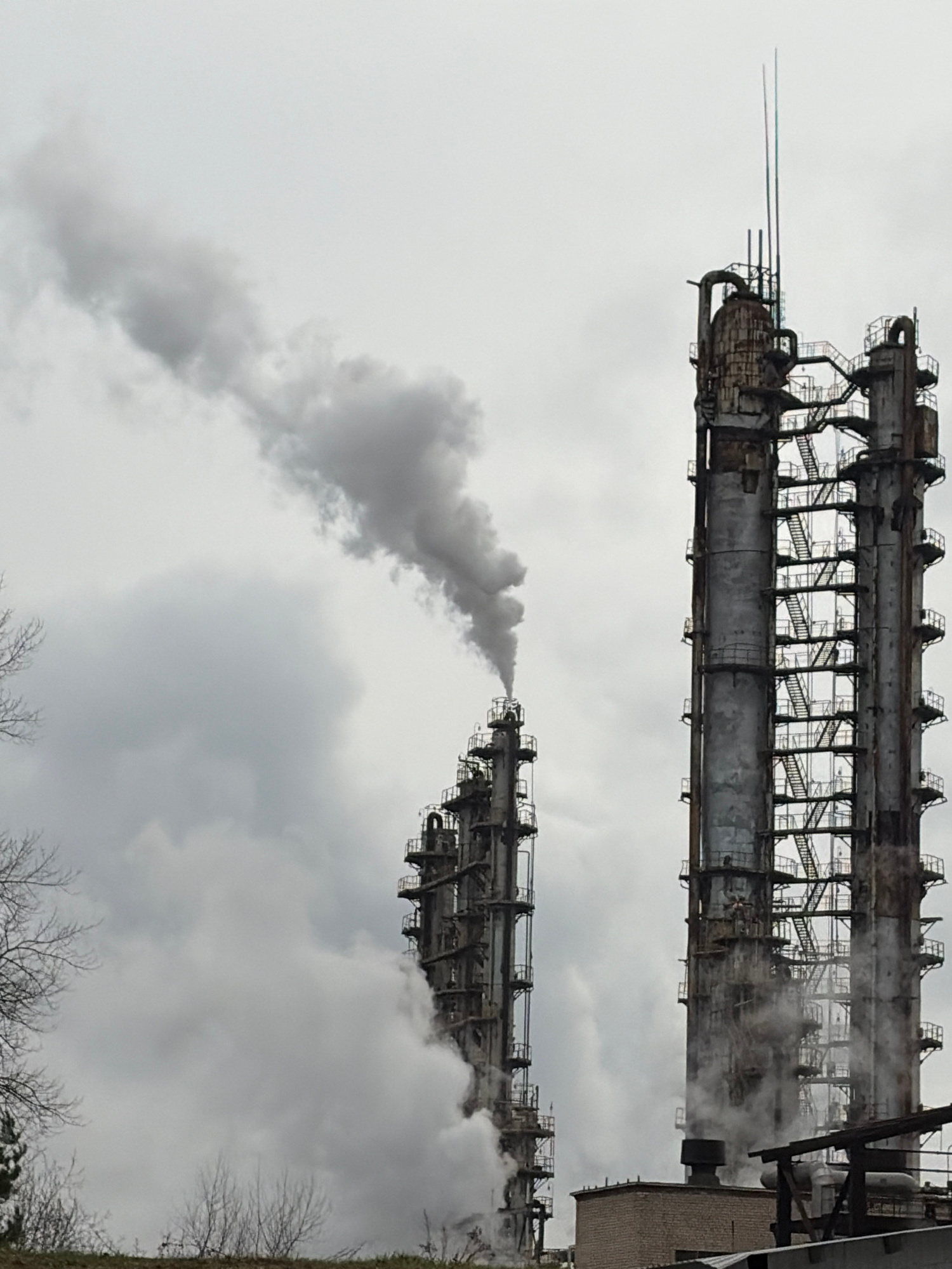 The image shows industrial structures against a cloudy sky. Two elongated, gray metal structures with external scaffolding and ladder systems dominate the upper portion of the image, with the larger s…read more
