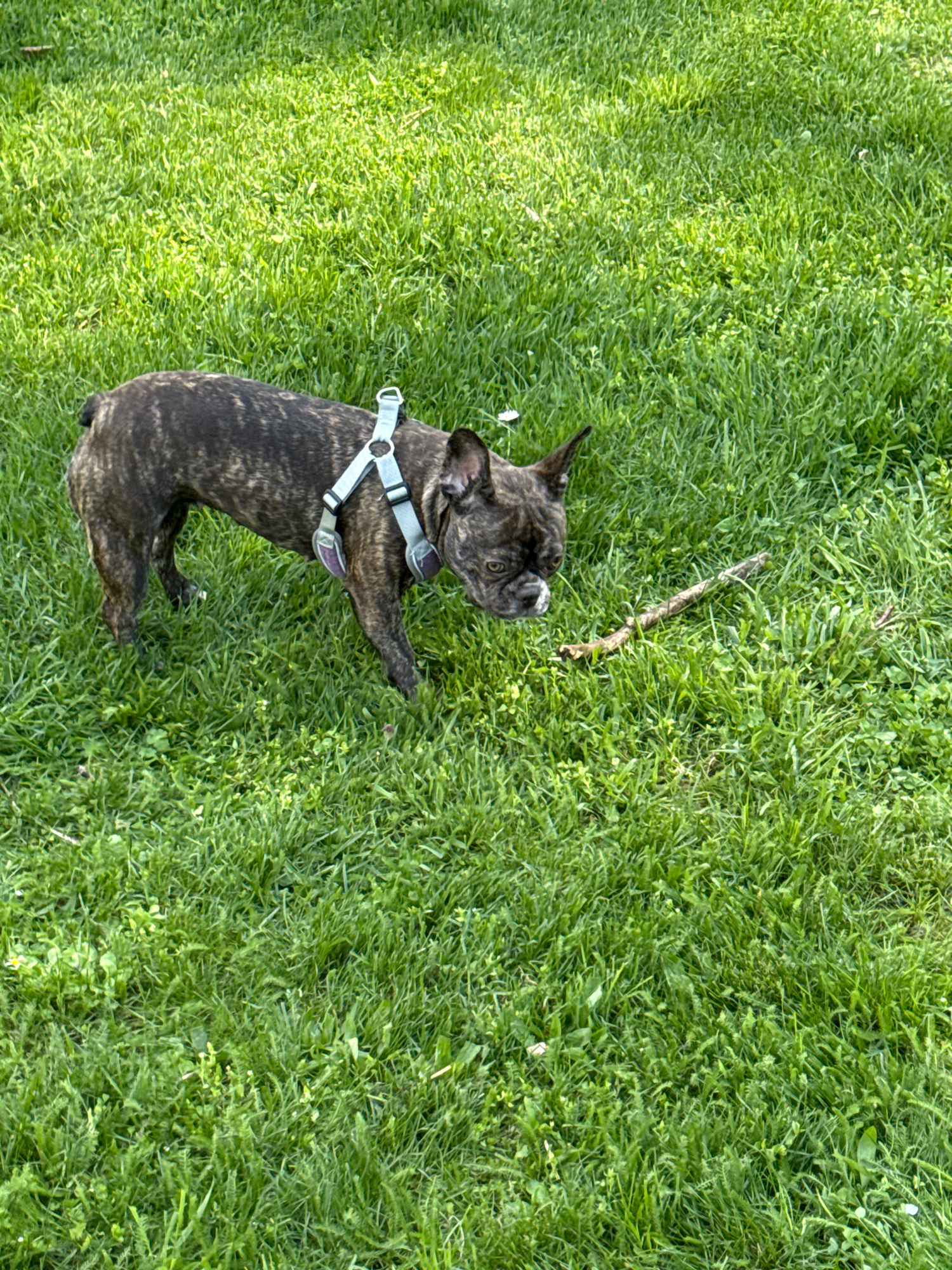 A brindle French Bulldog lies on its side in a patch of green grass, looking up at a thin brown stick lying a short distance in front of it. The dog is wearing a light gray harness. The scene is outdo…read more