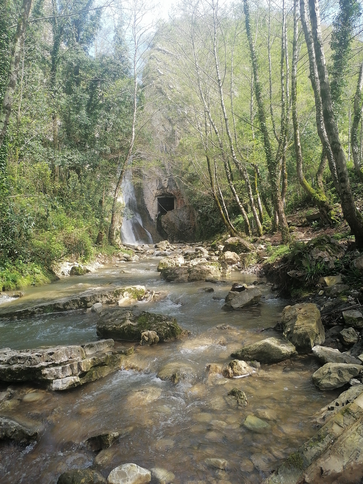 The image depicts a river flowing through a forest landscape. In the background, a waterfall descends from a rocky cliff face that contains a cave opening secured with a metal grate. The riverbed is f…read more
