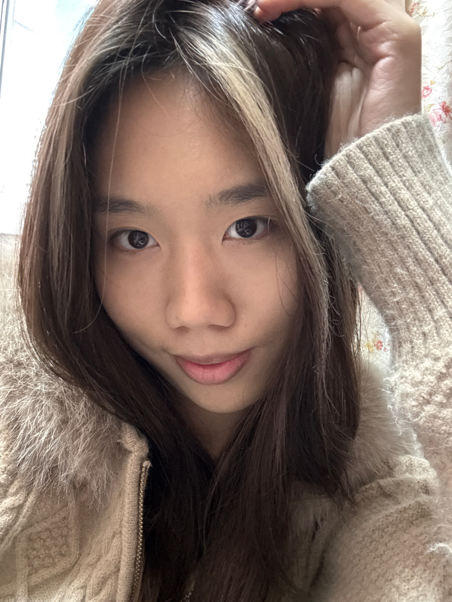 A close-up, angled portrait depicts a young woman with brown hair and a single blonde streak near her forehead. She has dark eyes and is smiling slightly. Her right hand is visible above her head, see…read more