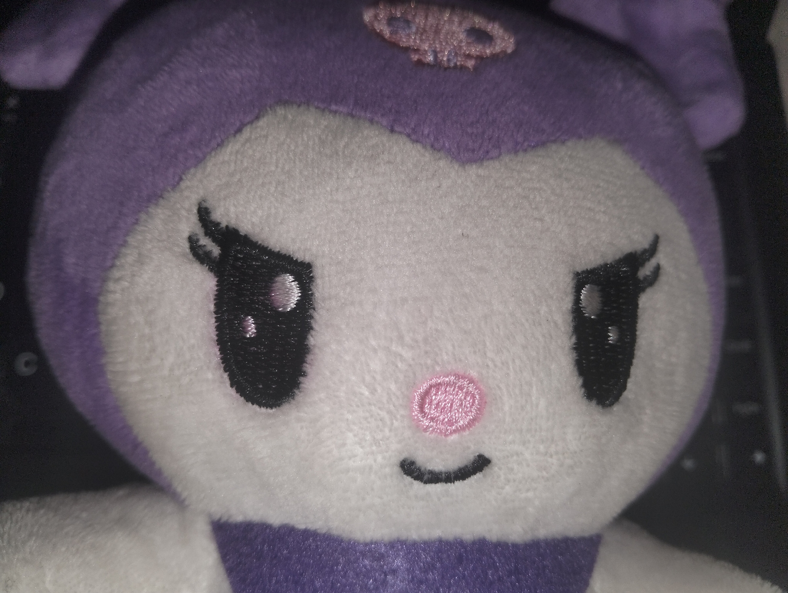 A close-up of a Kuromi plush toy shows its face. The plush is primarily purple and white with embroidered details: black eyes with white highlights, a pink, rounded nose, and a curved black mouth. A p…read more