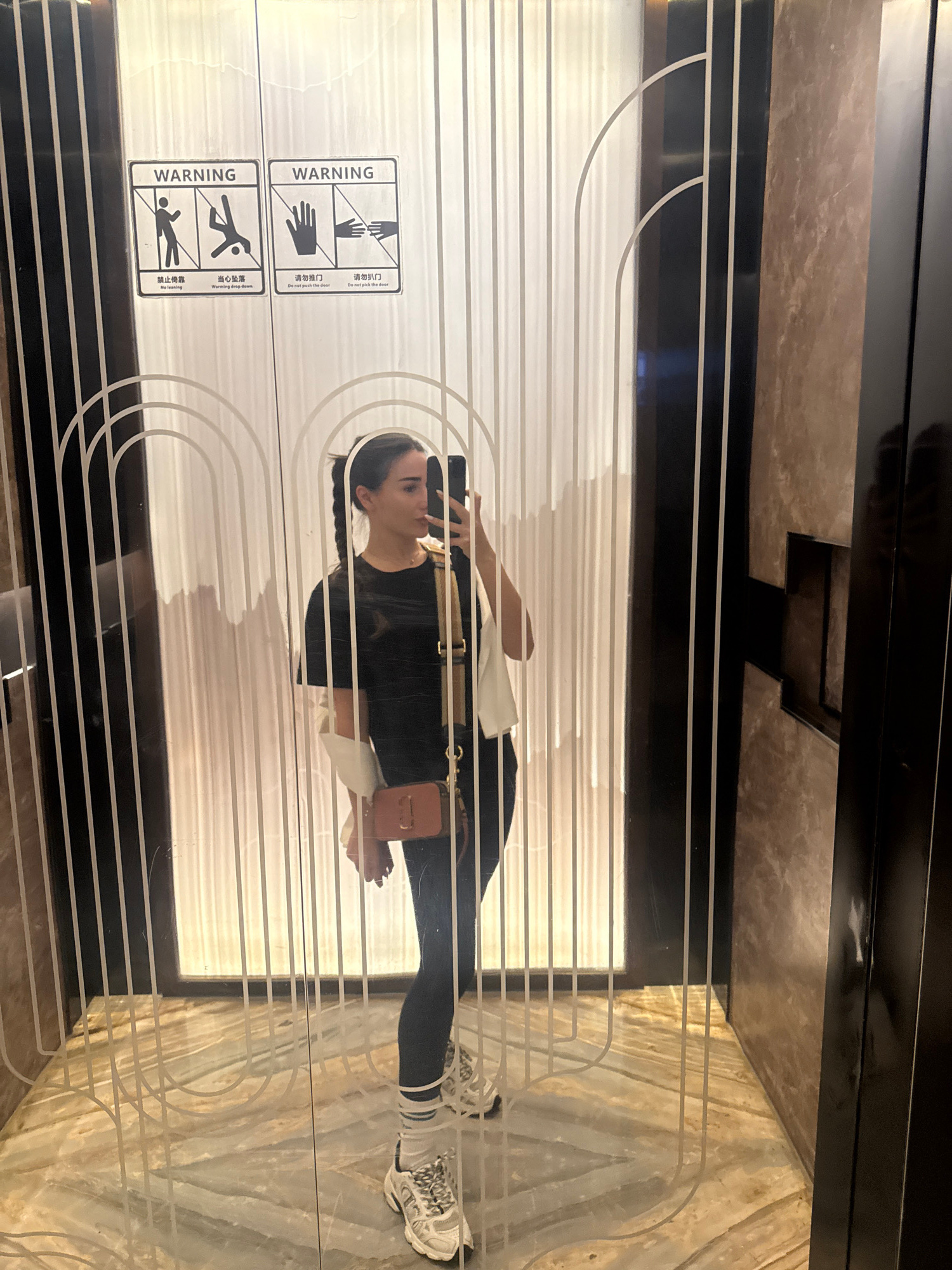A medium shot of the reflection of a woman taking a selfie in front of glass doors featuring a "WARNING" label written in English and Chinese, located in Yiwu, China. The woman is wearing black athletic apparel, white wrist warmers, and white sneakers. She holds a mobile phone in her left hand to take the photo and a small, tan purse hangs from her right shoulder. The surrounding architecture is contemporary, and the decor is marble and black. The lower warning label reads, "WARNING warming drop down," and depicts a stick figure falling downwards. The upper warning label reads, "WARNING do not pick the door," and displays hand icons reaching for the door. | Open Wire