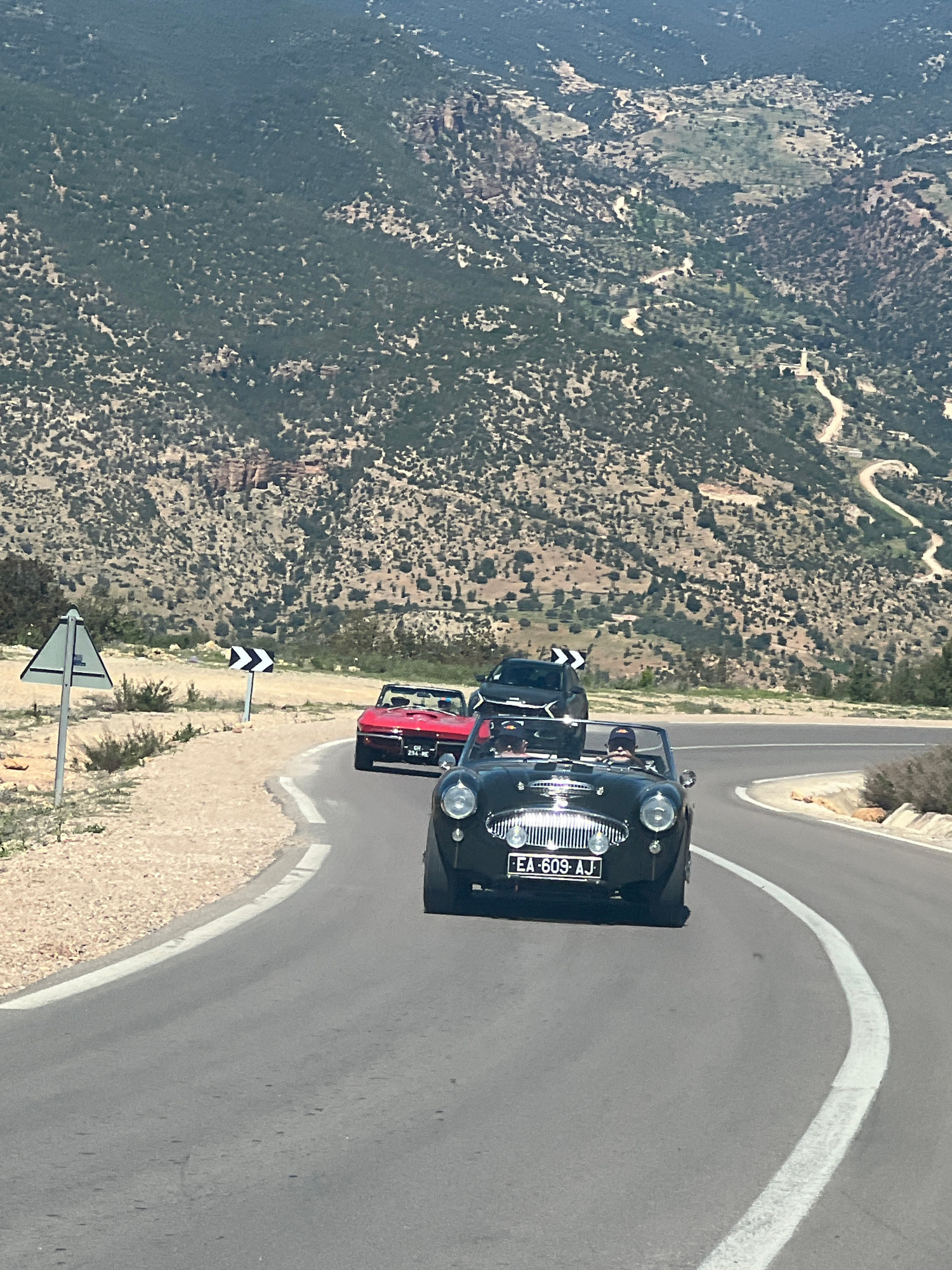 The image shows three vintage cars, one black, one dark, and one red, on a winding road next to a mountainside. The black car in the foreground has a license plate reading "EA-609-AJ". The location is…read more