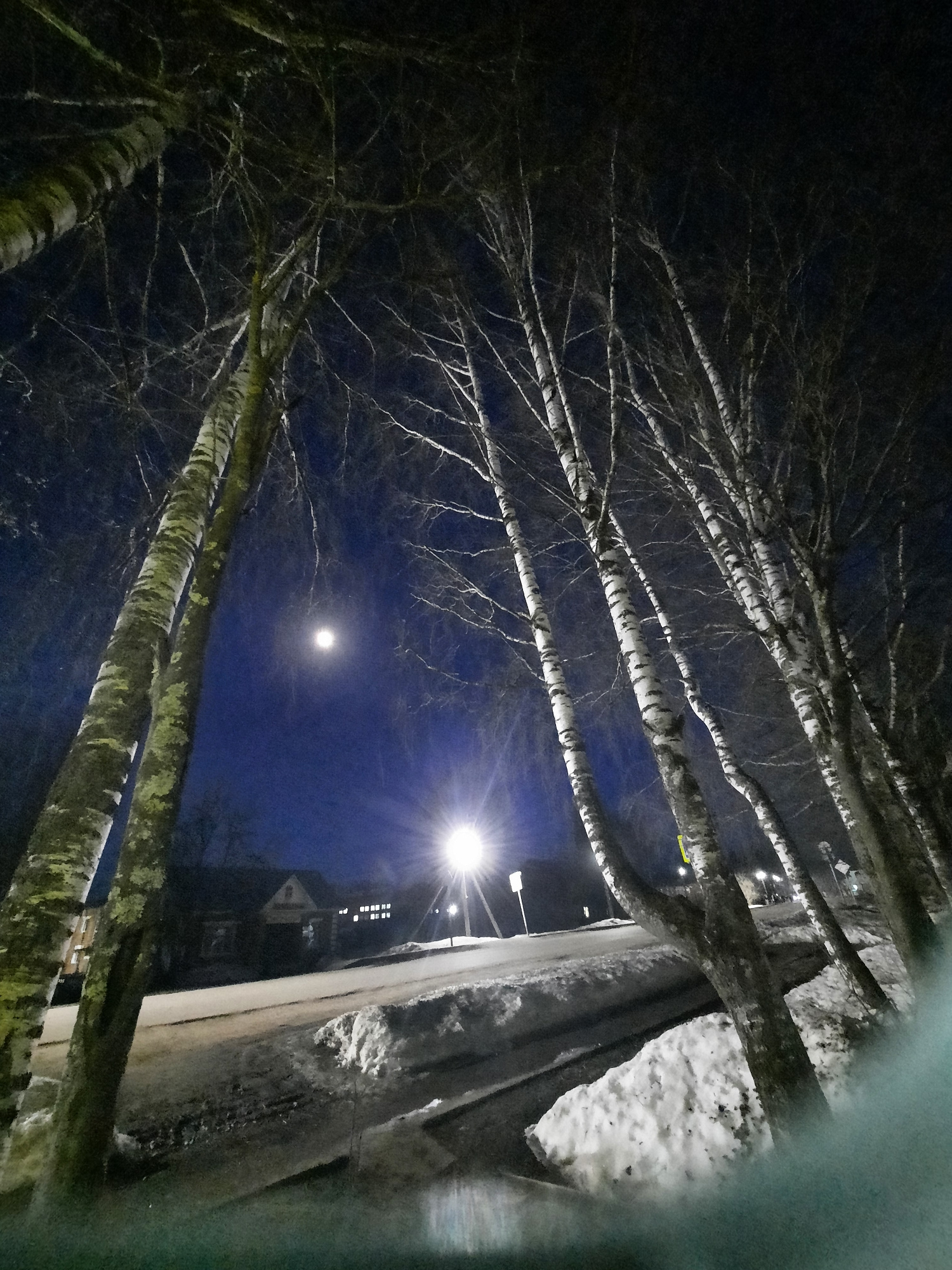 The image, taken from a low angle, depicts a night scene in what appears to be Krasnogorskoye, Russia. Several tall trees with light-colored bark stretch across the frame, their bare branches reaching…read more