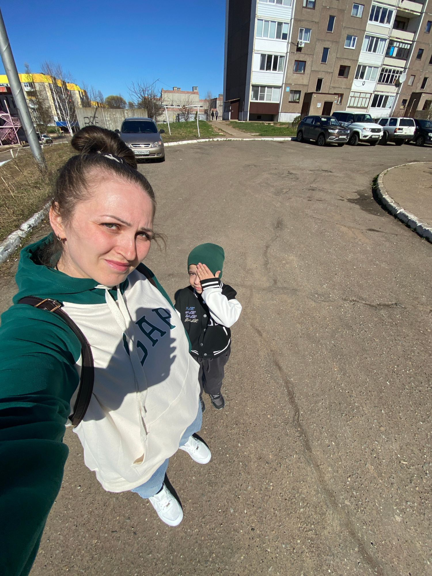 Here is a description of the image: The image shows a woman and a child in an outdoor setting, likely a city street in Марковский, Russia. The woman is holding the camera and facing the viewer. She h…read more