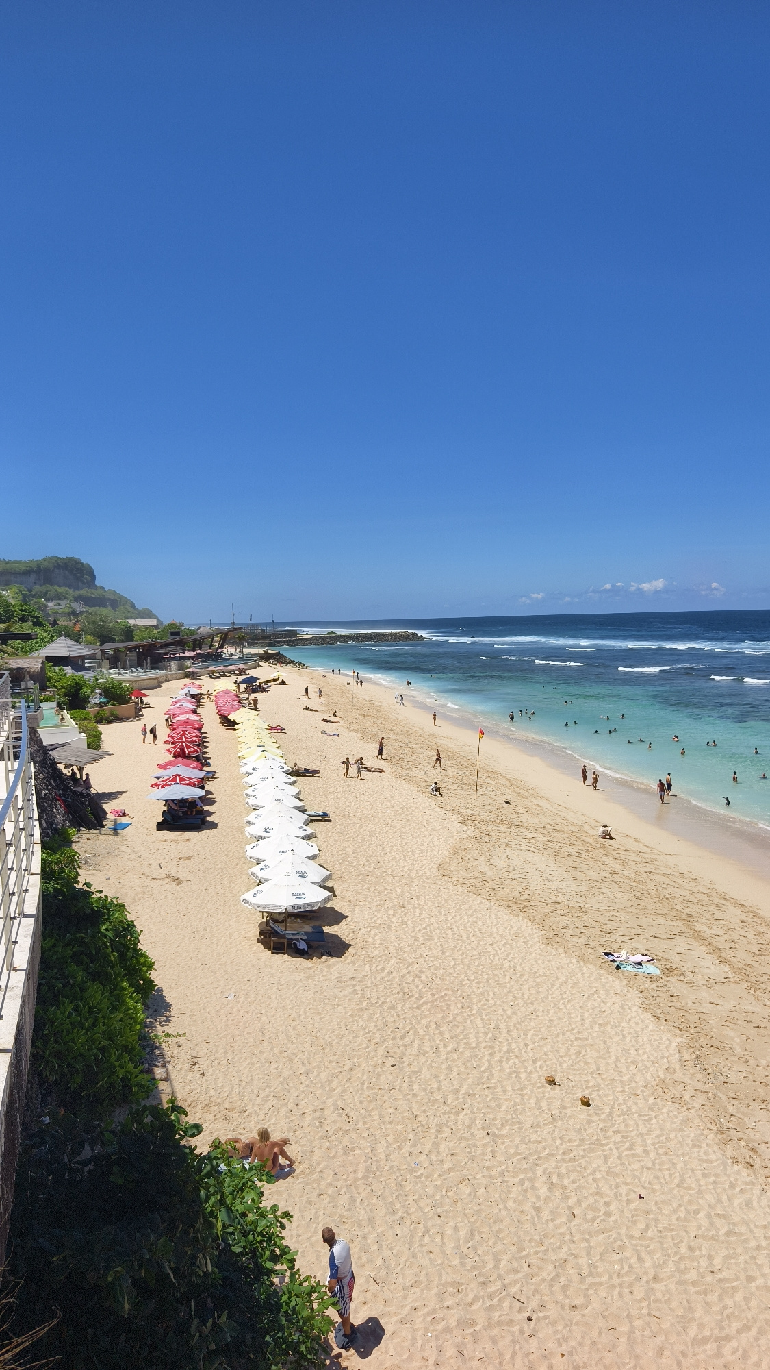 The image depicts a sunny beach scene in Kuta Selatan, Indonesia. A line of beach umbrellas, transitioning from red to white, stretches along the sandy shore. People are swimming in the ocean, sunbath…read more