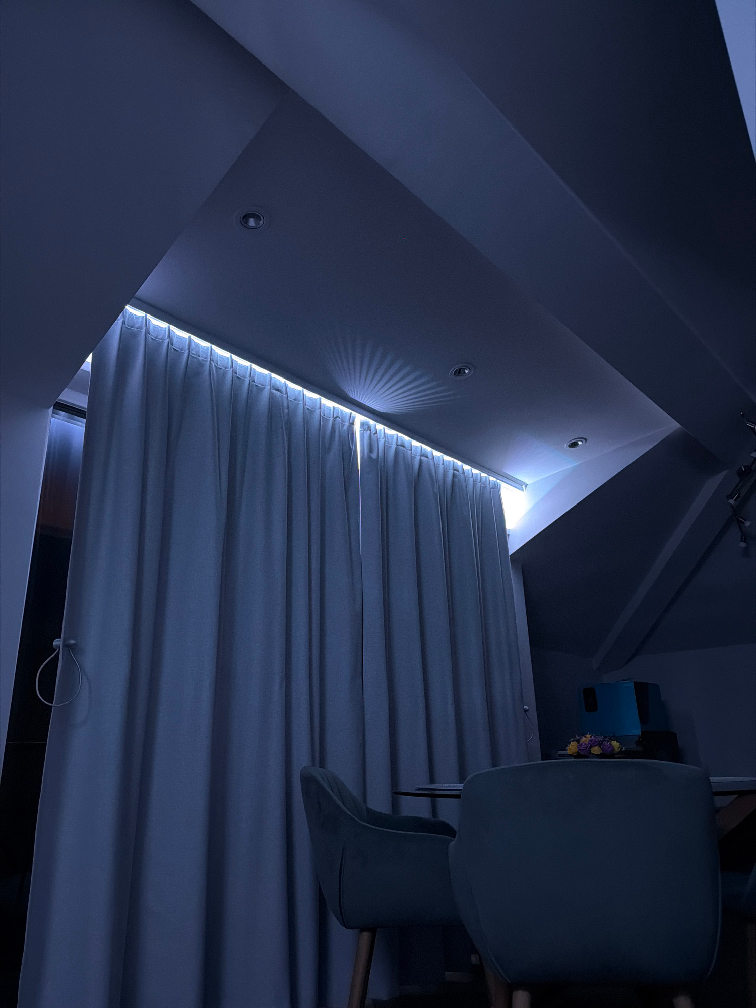 The image shows an interior space with a window covered by closed blinds, allowing light to penetrate through the slats. The walls and ceiling are painted in a dark blue color, with recessed lighting…read more