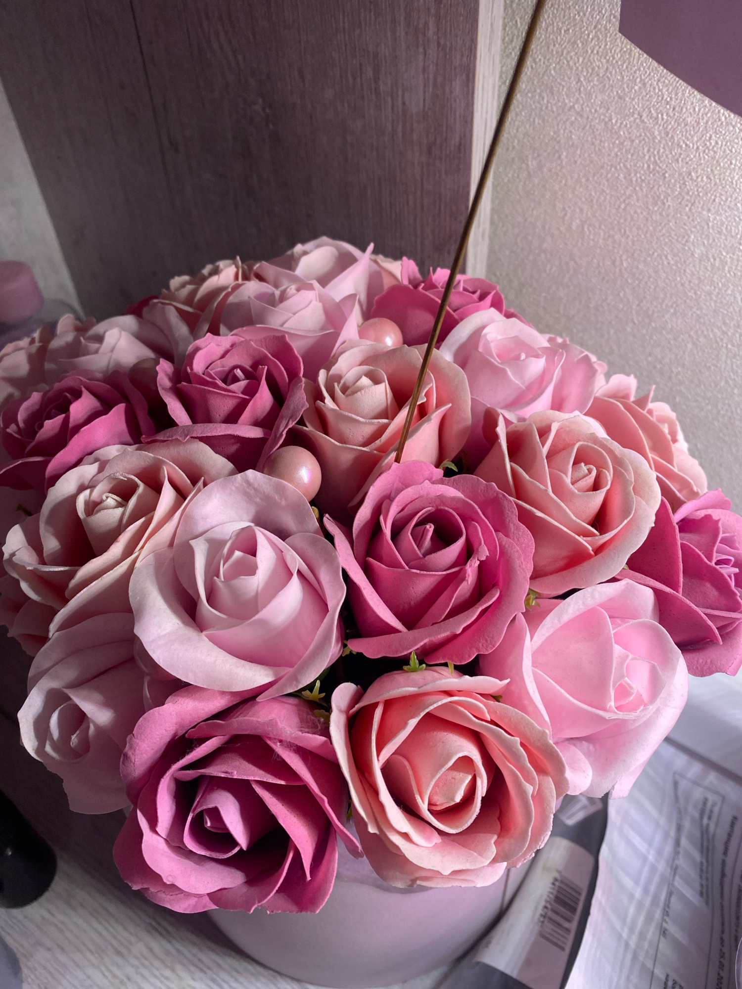 A close-up shows an arrangement of pink and purple roses. The roses are clustered tightly together, forming a dense bouquet. The arrangement is situated indoors, with a wall visible in the background.…read more
