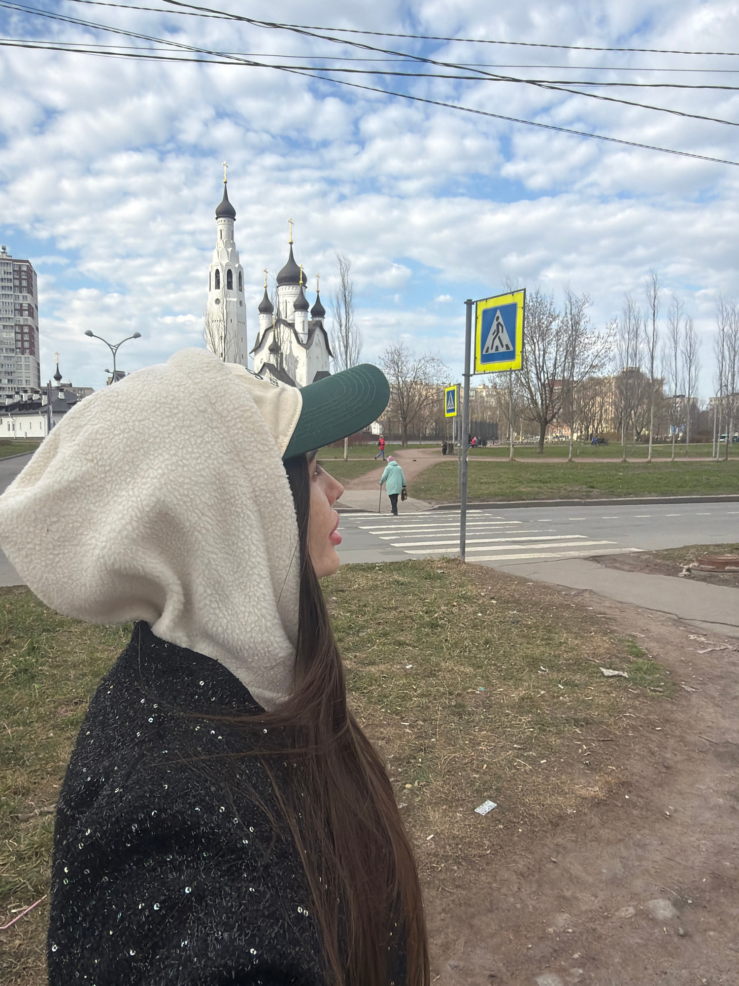 The image depicts an outdoor urban scene, featuring a person in the foreground looking upwards, and a street with a prominent Orthodox church in the background. The main subject, a person with long d…read more