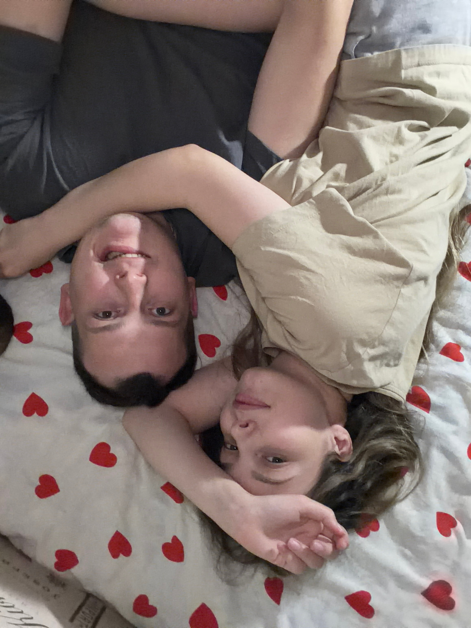 Two people, a man and a woman, are lying on a bed with a white sheet covered in red heart patterns. The man is wearing a dark gray t-shirt and is smiling. The woman is wearing a tan t-shirt. Both have…read more
