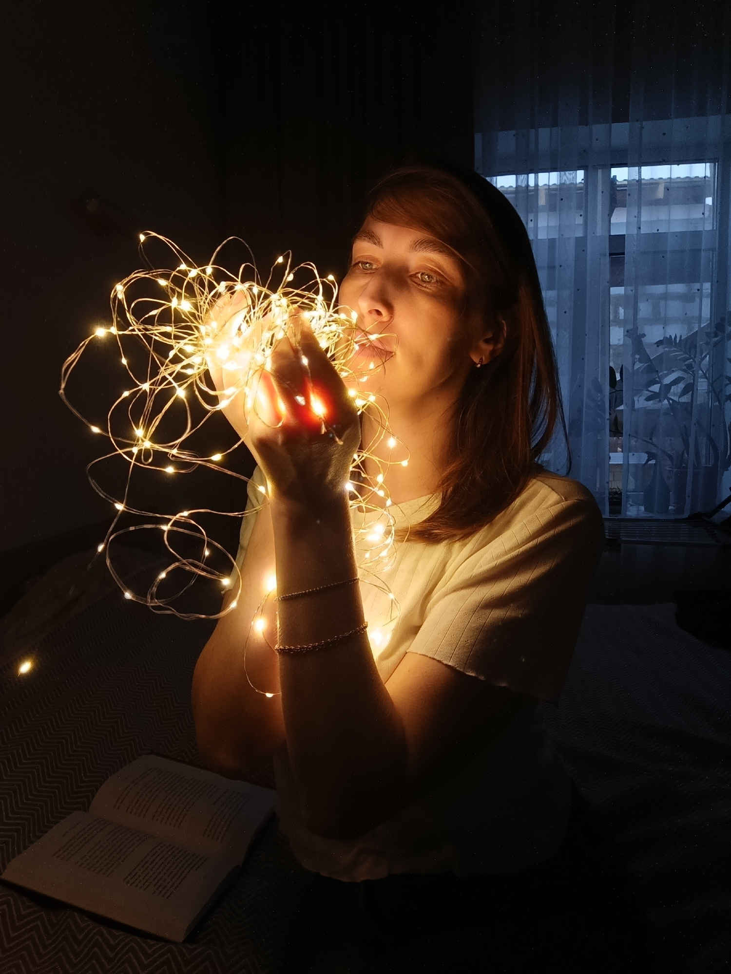 A woman with reddish-brown hair and light skin holds a tangle of warm white LED string lights in both hands, close to her face, in a dark interior. She wears a light-colored, short-sleeved shirt and a…read more