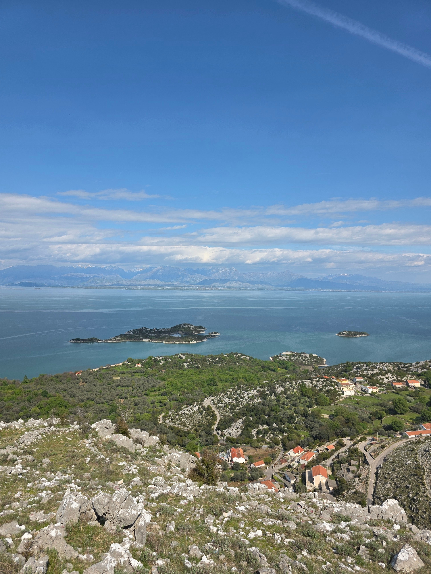 The image depicts a view from a high vantage point in Donji Murići, Montenegro, showcasing a coastal landscape. The sky is clear blue with some streaky clouds. Below, there's a body of water that appe…read more