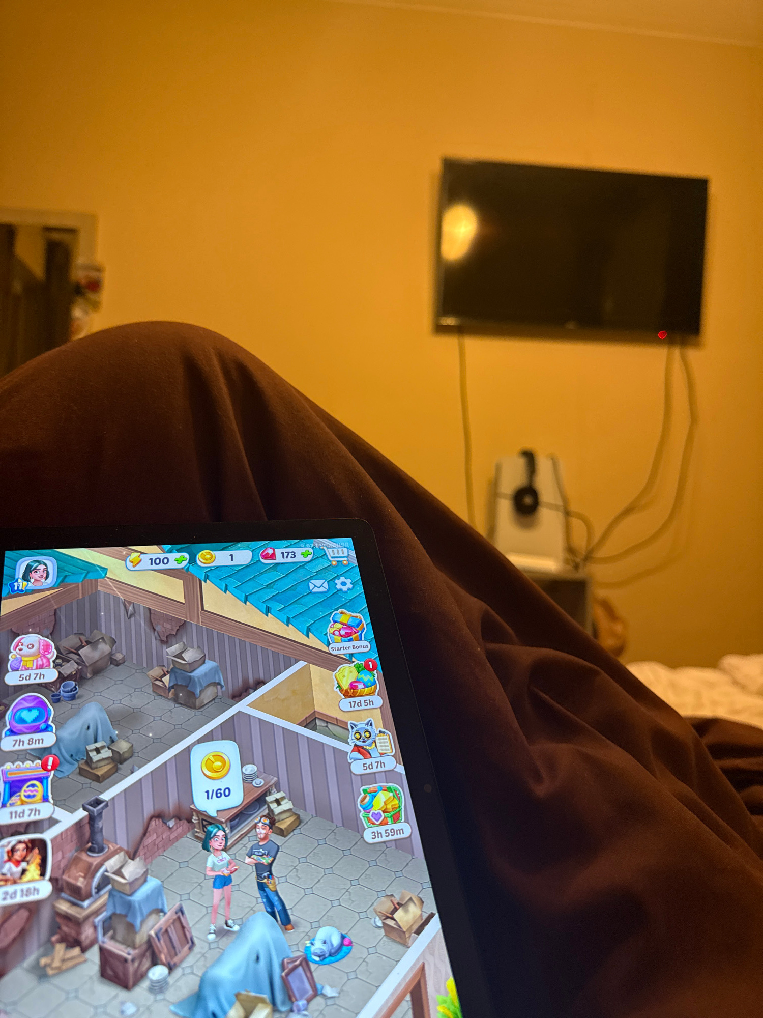 A low-angle shot depicts a person sitting in a soft, brown garment, with a tablet resting on their lap displaying a mobile game. In the background, a flat-screen television is mounted on a yellow wallβ¦read more