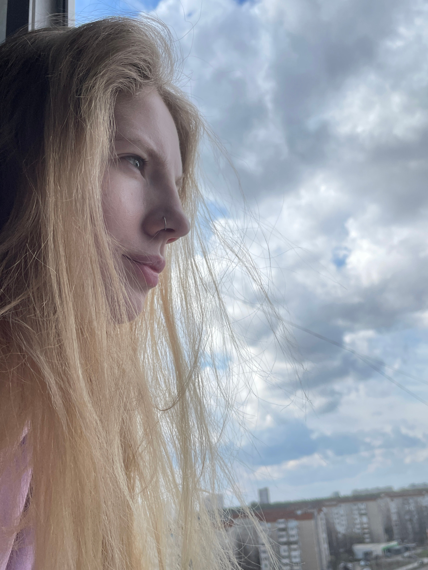 The image is a close-up, low-angle photograph of a young person's head and hair, captured with the camera rotated. The person, who has long blonde hair, is looking upwards towards the sky. Their face…read more