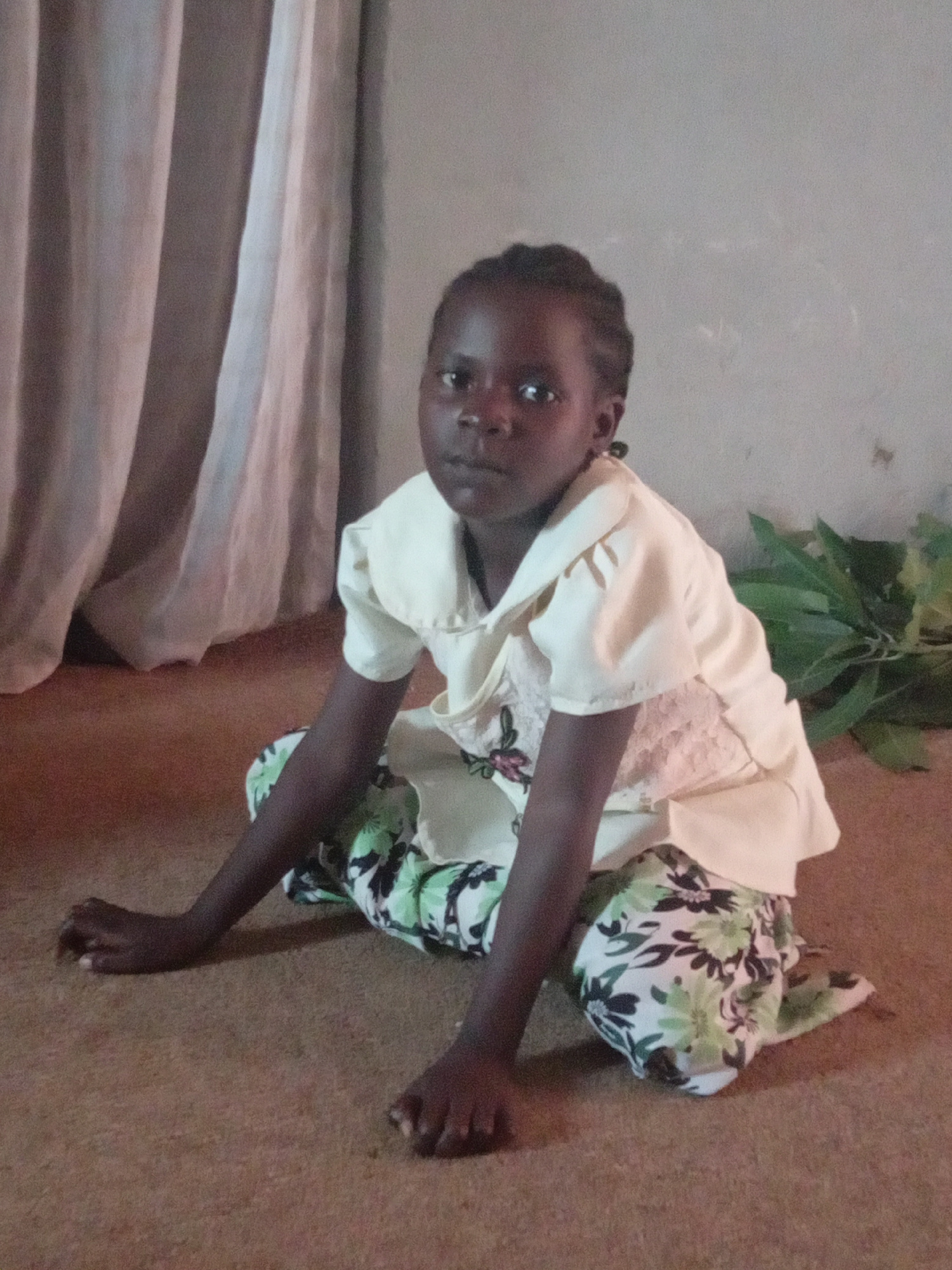 A young, dark-skinned girl with braided hair is kneeling on a light brown floor. She wears a light yellow blouse with a lace inset, and patterned pants with green and white floral designs. Her arms ar…read more