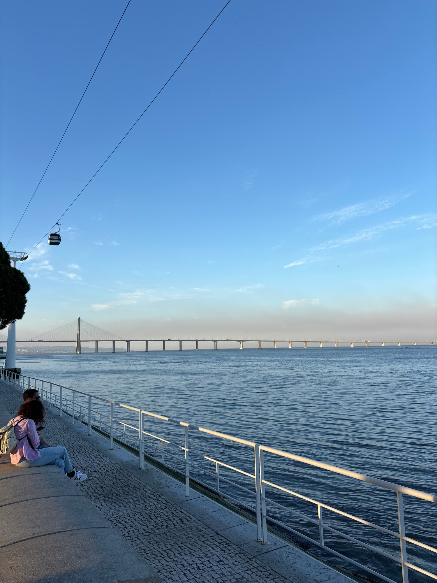 The image captures a sunny day in Lisbon, Portugal. The Vasco da Gama Bridge stretches across the Tagus River in the background. A cable car line is visible in the left foreground, with one of the cab…read more