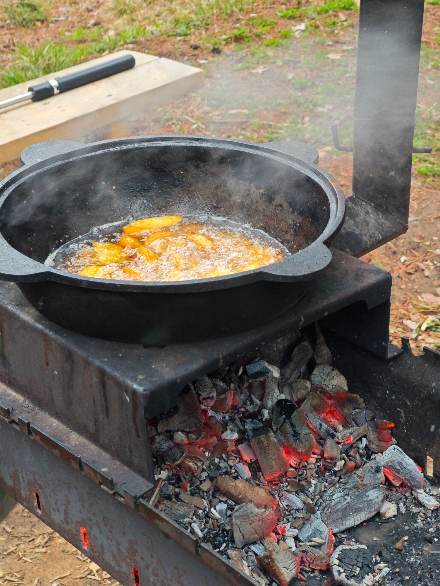 This outdoor scene, set in Мишкино, Russia, captures food being cooked in a large, black cast-iron pot, commonly known as a kazan. The pot is placed directly over a metal grill or brazier (mangala) filled with glowing red and grey charcoal embers, indicating active cooking. Inside the pot, pieces of what appear to be potatoes are deep-frying or pan-frying in bubbling oil, with steam or smoke visibly rising from the hot food and oil. The grill itself is a sturdy metal structure, showing signs of use and heat, with some visible rust and wear. To the right of the pot, a vertical chimney or smoke stack is integrated into the grill, directing smoke upwards. In the background, a wooden board lies on the ground, and on it rests a long, black and silver metal tool, possibly a skewer or a handle for a cooking utensil. The ground consists of dirt and patches of green and dry grass, suggesting a natural outdoor environment like a backyard or a picnic area. The lighting indicates it is daytime. No people are visible, and there is no visible text in the image. | Open Wire