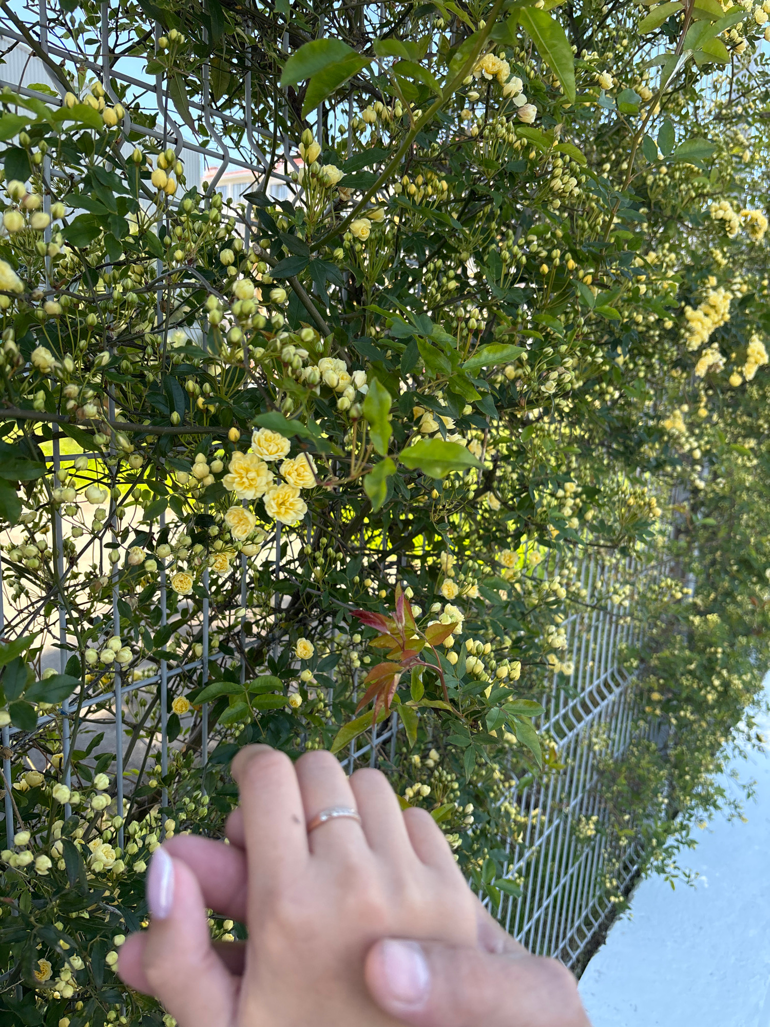 This image presents a vibrant outdoor scene primarily focused on a lush climbing plant, likely a Banksia rose, densely covered with numerous small yellow flowers and buds. Its rich green foliage, inte…read more