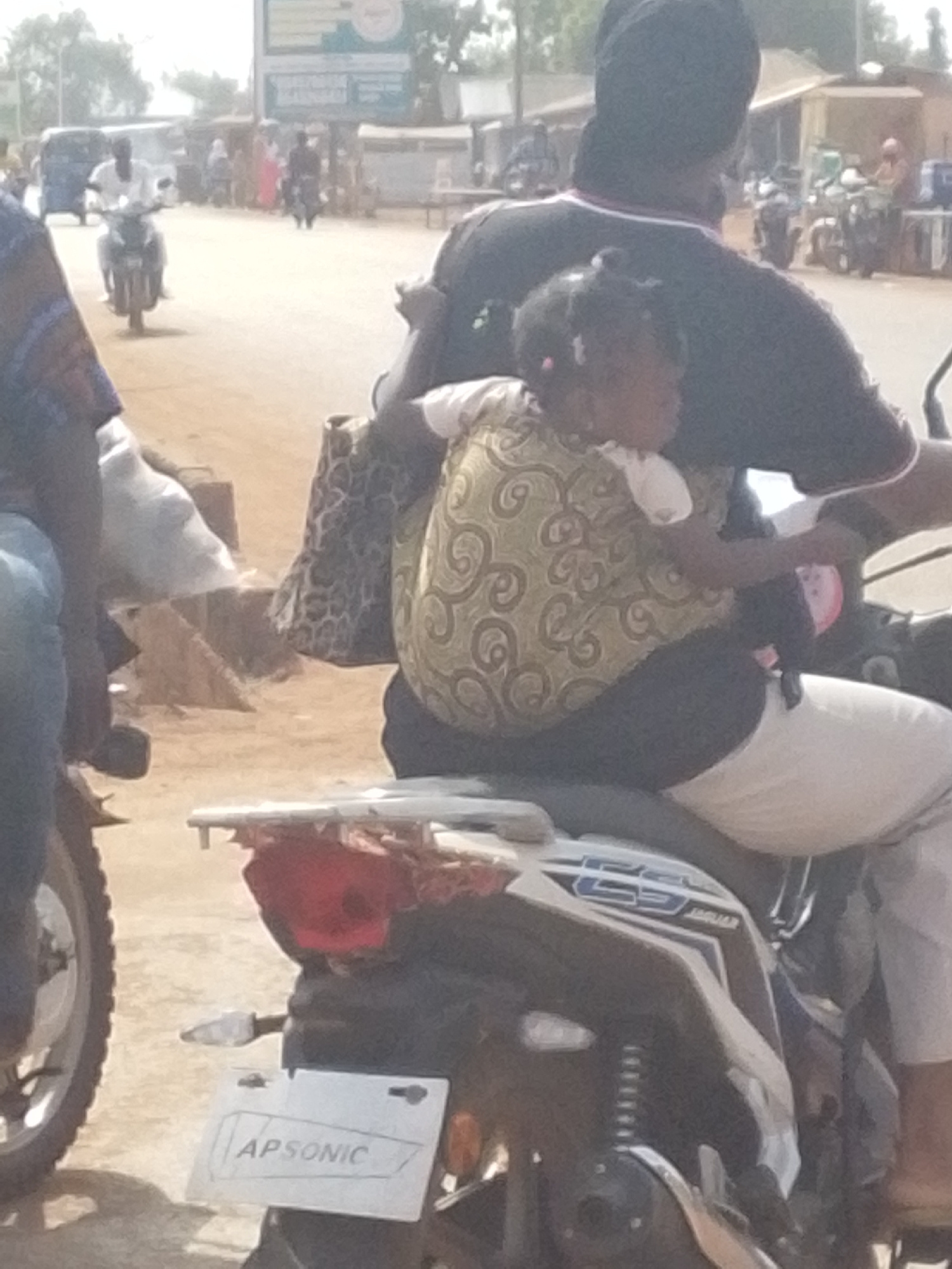 A medium-shot, eye-level photograph depicts a man on a motorcycle with a child strapped to his back. The motorcycle has a license plate with the name "APSONIC" written on it. The vehicle also has the…read more