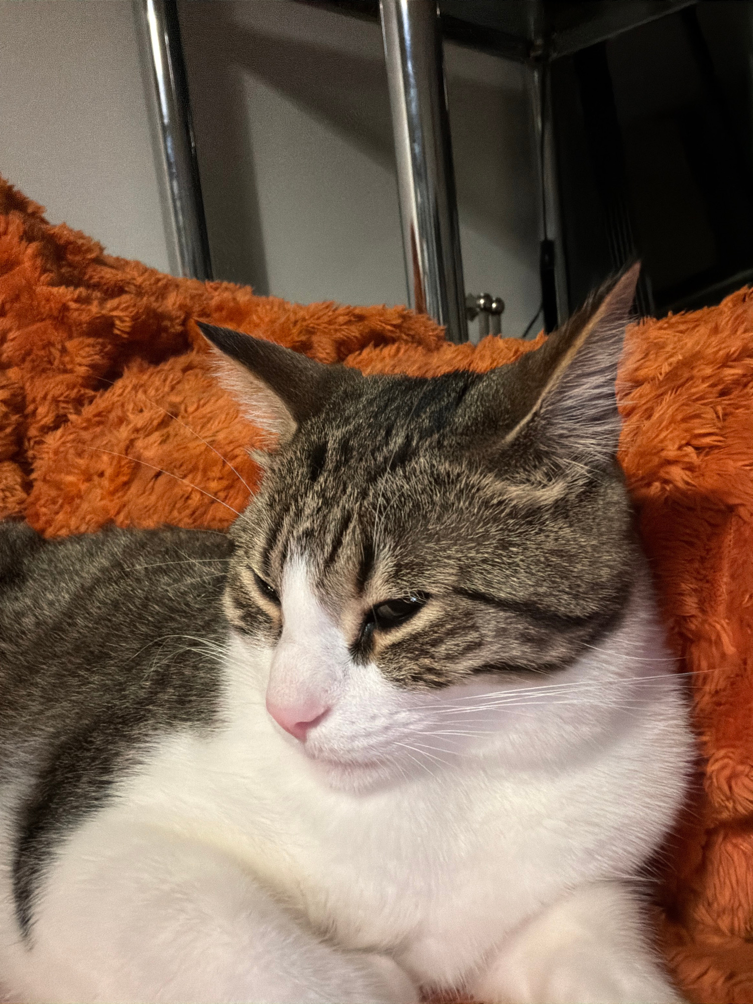 A tabby and white cat is lying on an orange, fluffy surface. The cat's head is positioned in the upper left quadrant of the image, with its body extending towards the lower right. The cat's eyes are c…read more