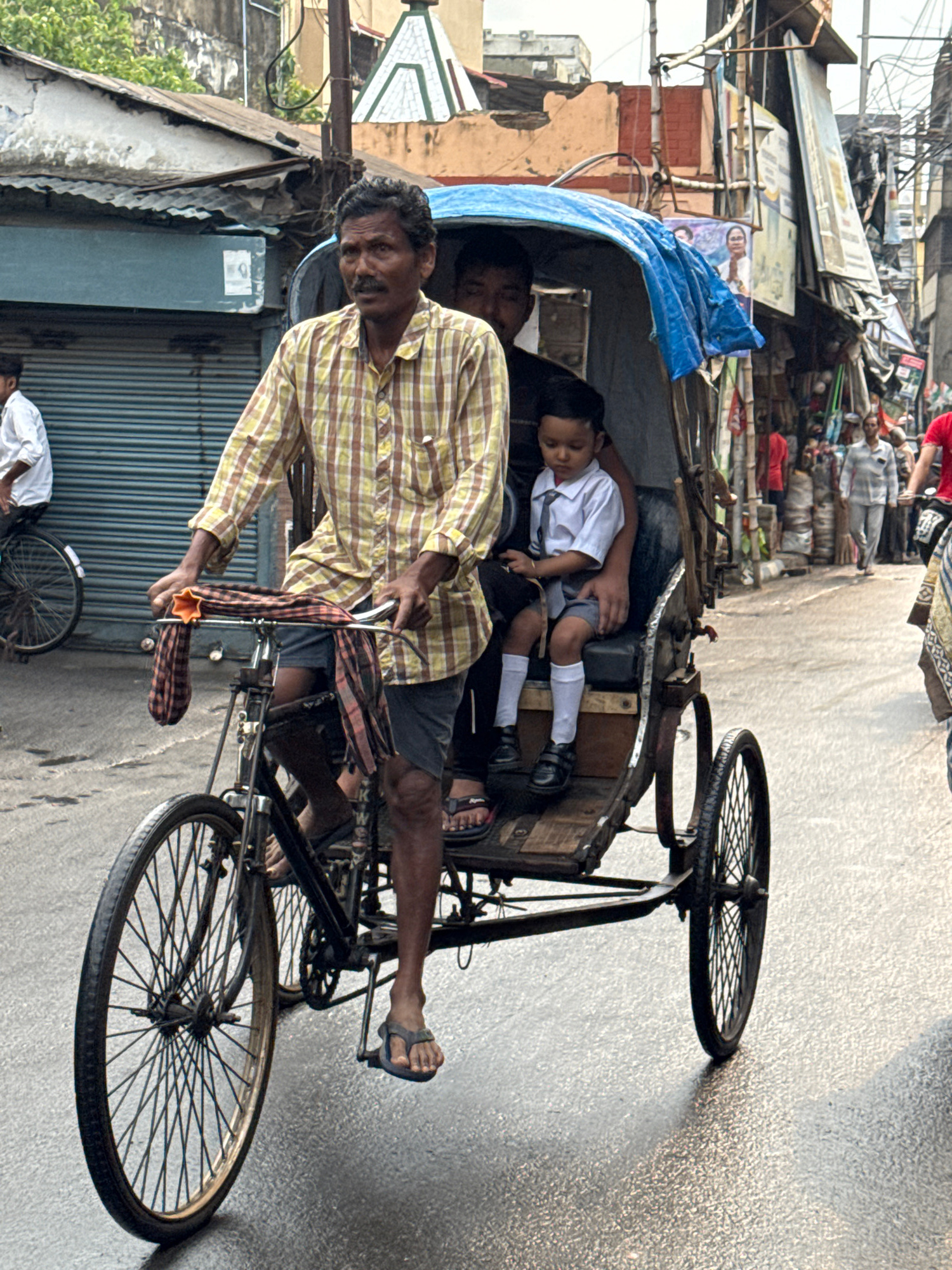 A man pulls a rickshaw through a street in Kolkata, India. The rickshaw contains two children, one of whom is asleep. The rickshaw is black, with a blue tarp stretched over a portion of the passenger…read more