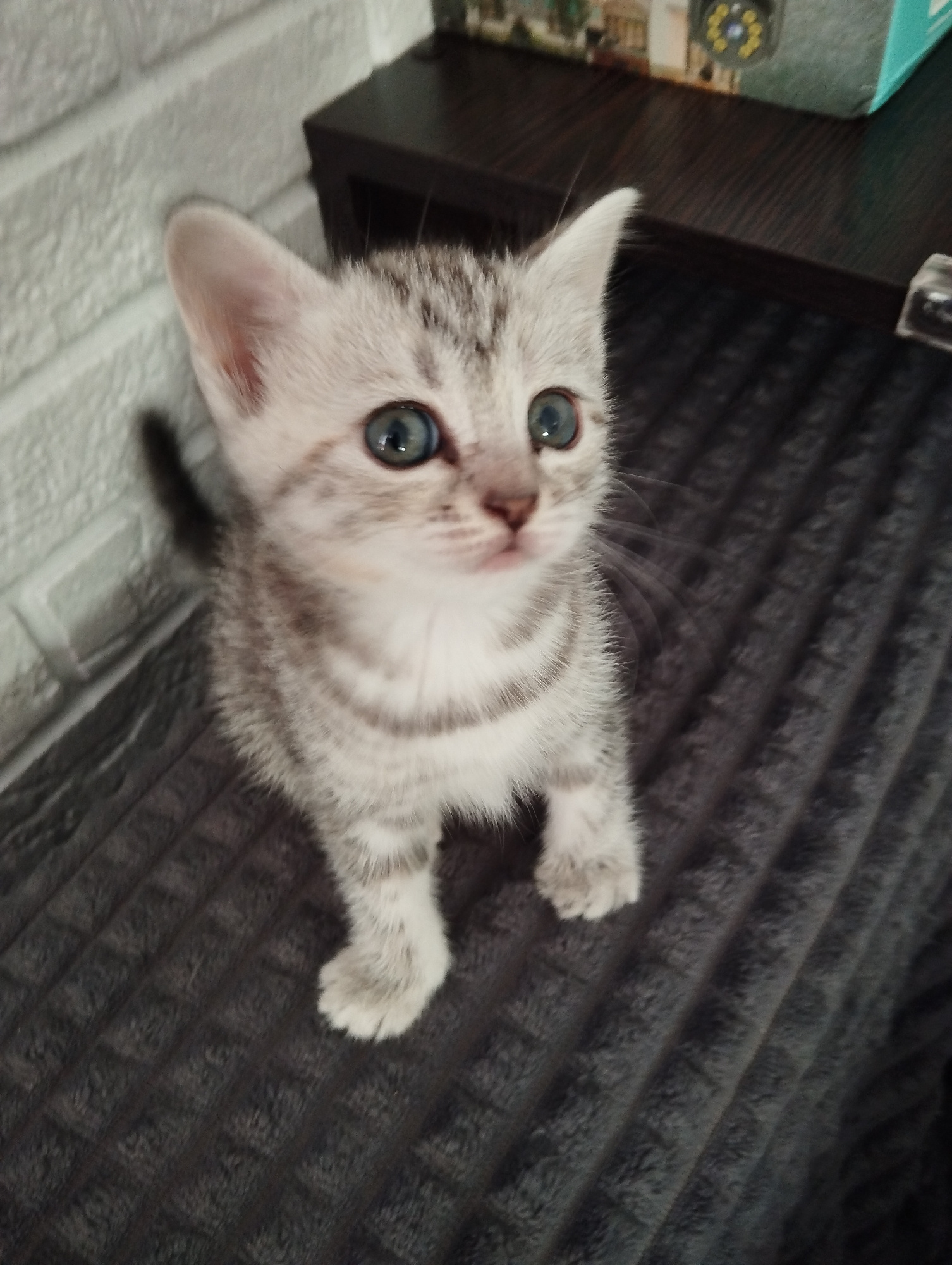 A close-up, slightly high-angle shot of a kitten. The kitten is standing on a gray, textured surface (possibly a blanket or upholstery). The kitten has light gray and white striped fur, light-colored…read more