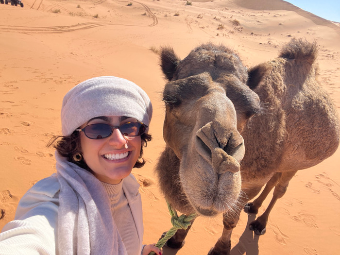 A close-up photograph depicts an adult female and a dromedary camel in a desert landscape near Rissani, Morocco, consistent with the Erg Chebbi dunes. The female, positioned on the left, is smiling di…read more